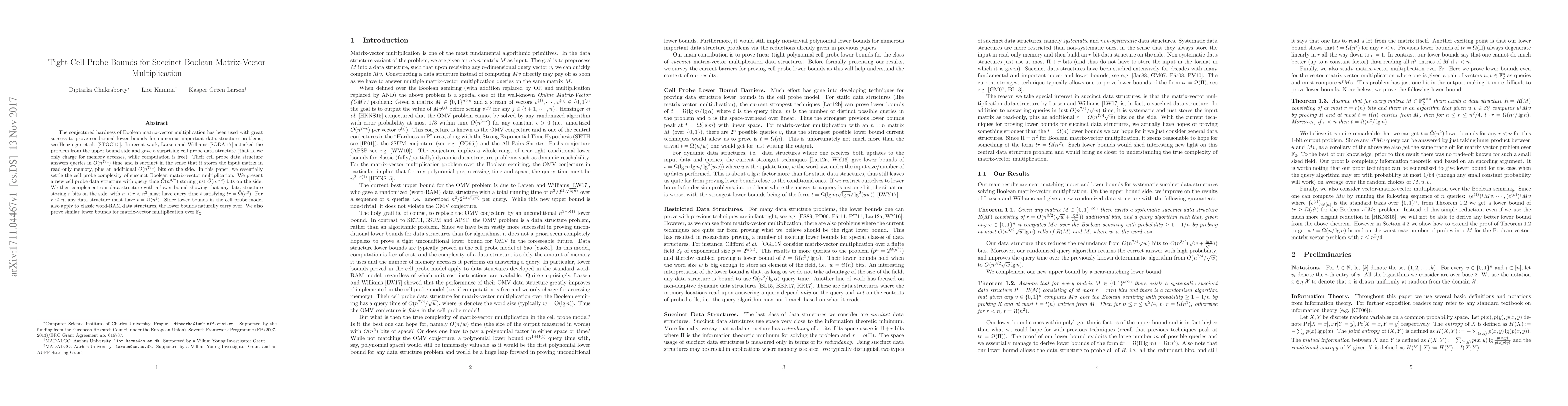 Researchers have created a new cell probe data structure that solves Boolean matrix-vector multiplication in $ ilde{O}(n^{3/2})$ time with only $ ilde{O}(n^{3/2})$ bits stored on the side, improving previous bounds.