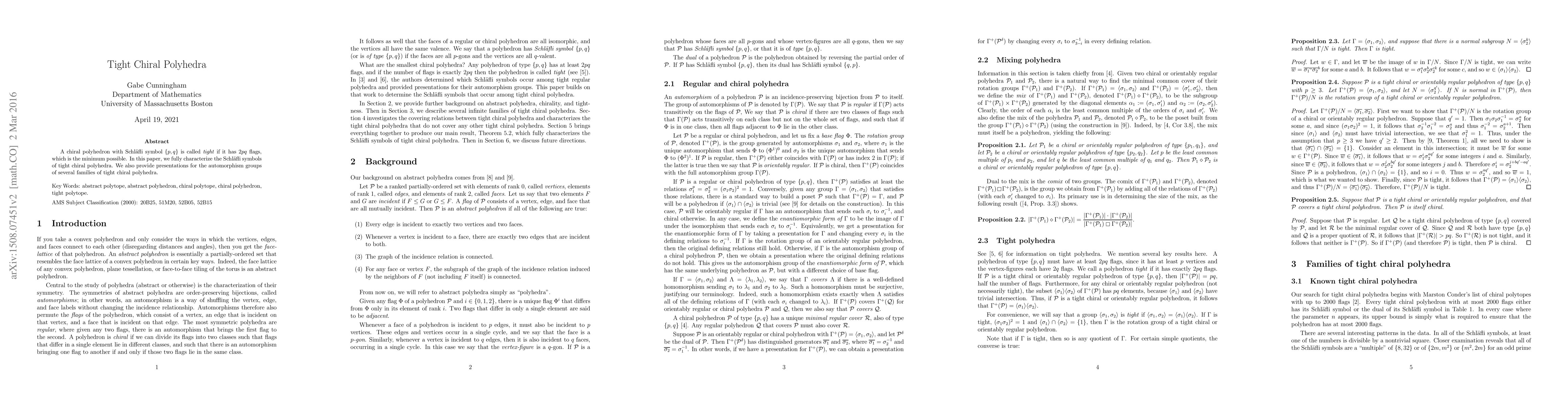 A chiral polyhedron with Schl\"afli symbol $\{p, q\}$ is called tight if it has $2pq$ flags, which is the minimum possible. In this paper, we fully characterize the Schl\"afli symbols of tight chiral polyhedra. We also provide presentations for the automorphism groups of several families of tight chiral polyhedra.