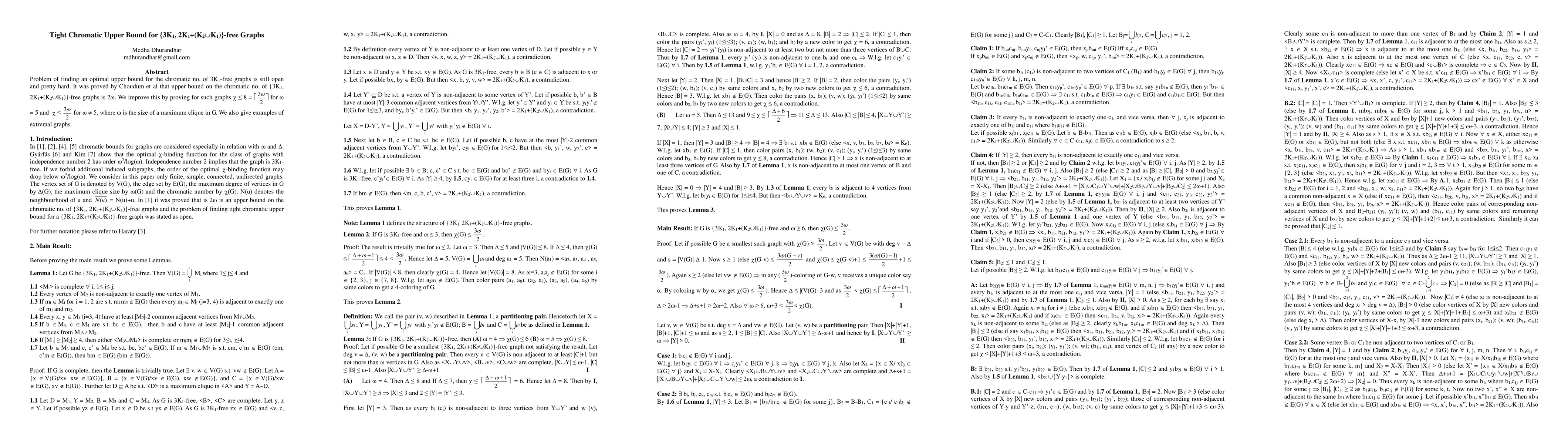 This paper improves the chromatic number upper bound for graphs that are free of certain subgraphs, specifically {3K1, {2K1 + (K2 ∪ K1)}-free graphs. It proves that the chromatic number is at most 3ω/2 for ω ≠ 5 and at most 8 for ω = 5, where ω represents the size of the largest clique in the graph, and provides extremal examples.