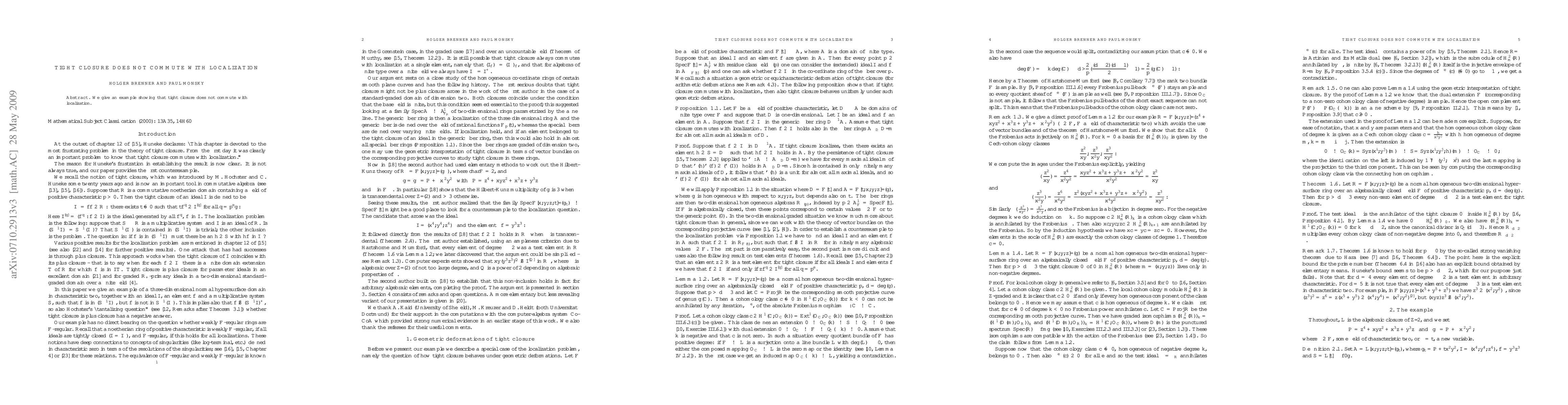 Summary: This paper demonstrates a specific instance where tight closure fails to commute with localization, highlighting a limitation in the behavior of tight closure in algebraic structures. The example serves as a counterexample to the general expectation that these operations would interact in a predictable manner.