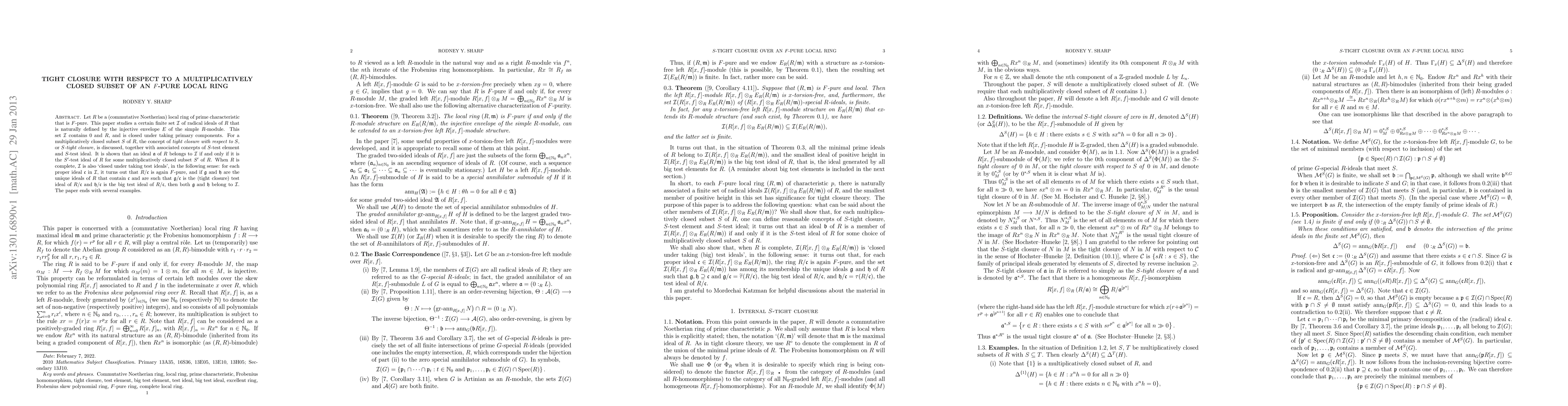 This paper investigates the concept of tight closure with respect to a multiplicatively closed subset in an $F$-pure local ring $R$, defining a set ${\mathcal I}$ of radical ideals. It demonstrates that an ideal belongs to ${\mathcal I}$ if it is the $S'$-test ideal for some $S'$ and explores properties when $R$ is complete, showing that ${\mathcal I}$ remains closed under taking test ideals.