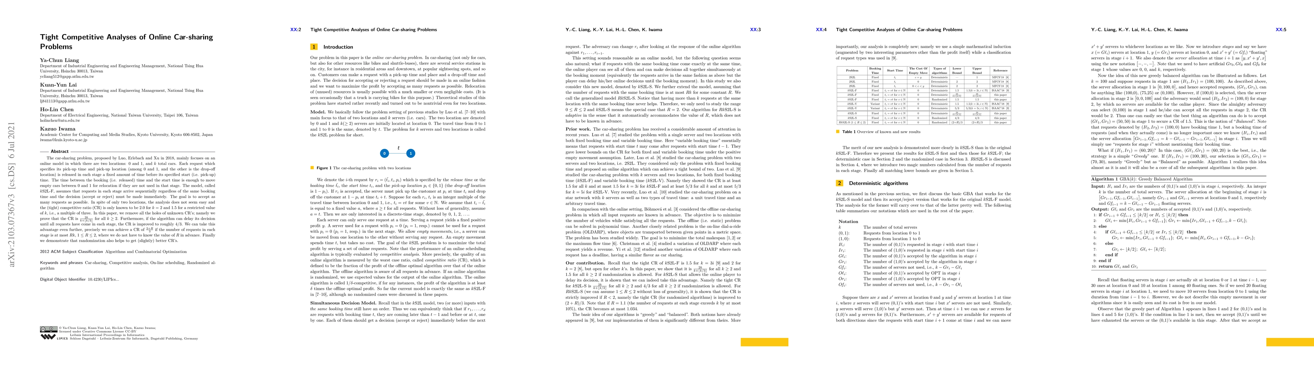 The car-sharing problem, proposed by Luo, Erlebach and Xu in 2018, mainly focuses on an online model in which there are two locations: 0 and 1, and $k$ total cars. Each request which specifies its pick-up time and pick-up location (among 0 and 1, and the other is the drop-off location) is released in each stage a fixed amount of time before its specified start (i.e. pick-up) time. The time between the booking (i.e. released) time and the start time is enough to move empty cars between 0 and 1 for relocation if they are not used in that stage. The model, called $k$S2L-F, assumes that requests in each stage arrive sequentially regardless of the same booking time and the decision (accept or reject) must be made immediately. The goal is to accept as many requests as possible. In spite of only two locations, the analysis does not seem easy and the (tight) competitive ratio (CR) is only known to be 2.0 for $k=2$ and 1.5 for a restricted value of $k$, i.e., a multiple of three. In this paper, we remove all the holes of unknown CR's; namely we prove that the CR is $\frac{2k}{k + \lfloor k/3 \rfloor}$ for all $k\geq 2$. Furthermore, if the algorithm can delay its decision until all requests have come in each stage, the CR is improved to roughly 4/3. We can take this advantage even further, precisely we can achieve a CR of $\frac{2+R}{3}$ if the number of requests in each stage is at most $Rk$, $1 \leq R \leq 2$, where we do not have to know the value of $R$ in advance. Finally we demonstrate that randomization also helps to get (slightly) better CR's.