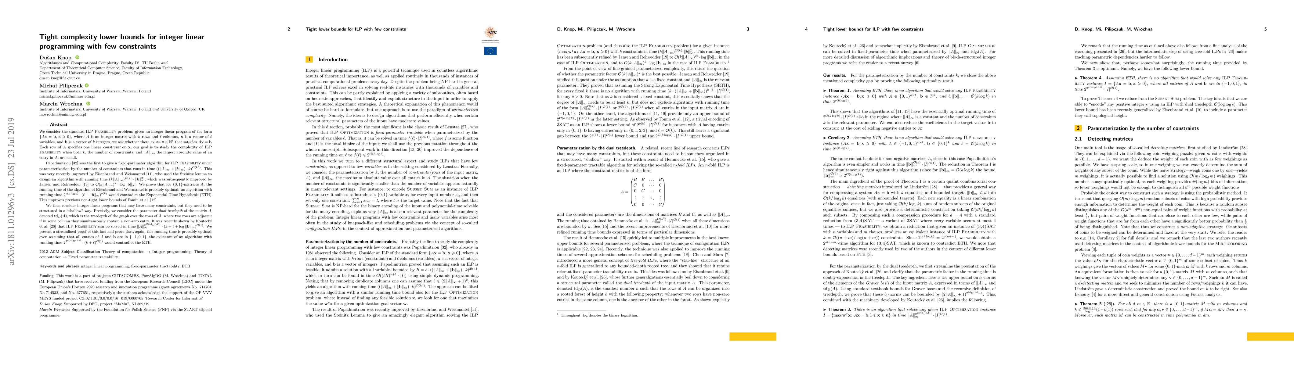 We consider the ILP Feasibility problem: given an integer linear program $\{Ax = b, x\geq 0\}$, where $A$ is an integer matrix with $k$ rows and $\ell$ columns and $b$ is a vector of $k$ integers, we ask whether there exists $x\in\mathbb{N}^\ell$ that satisfies $Ax = b$. Our goal is to study the complexity of ILP Feasibility when both $k$, the number of constraints (rows of $A$), and $\|A\|_\infty$, the largest absolute value in $A$, are small. Papadimitriou [J. ACM, 1981] was the first to give a fixed-parameter algorithm for ILP Feasibility in this setting, with running time $\left((\|A\mid b\|_\infty) \cdot k\right)^{O(k^2)}$. This was very recently improved by Eisenbrand and Weismantel [SODA 2018], who used the Steinitz lemma to design an algorithm with running time $(k\|A\|_\infty)^{O(k)}\cdot \|b\|_\infty^2$, and subsequently by Jansen and Rohwedder [2018] to $O(k\|A\|_\infty)^{k}\cdot \log \|b\|_\infty$. We prove that for $\{0,1\}$-matrices $A$, the dependency on $k$ is probably optimal: an algorithm with running time $2^{o(k\log k)}\cdot (\ell+\|b\|_\infty)^{o(k)}$ would contradict ETH. This improves previous non-tight lower bounds of Fomin et al. [ESA 2018]. We then consider ILPs with many constraints, but structured in a shallow way. Precisely, we consider the dual treedepth of the matrix $A$, which is the treedepth of the graph over the rows of $A$, with two rows adjacent if in some column they both contain a non-zero entry. It was recently shown by Kouteck\'{y} et al. [ICALP 2018] that ILP Feasibility can be solved in time $\|A\|_\infty^{2^{O(td(A))}}\cdot (k+\ell+\log \|b\|_\infty)^{O(1)}$. We present a streamlined proof of this fact and prove optimality: even assuming that all entries of $A$ and $b$ are in $\{-1,0,1\}$, the existence of an algorithm with running time $2^{2^{o(td(A))}}\cdot (k+\ell)^{O(1)}$ would contradict ETH.