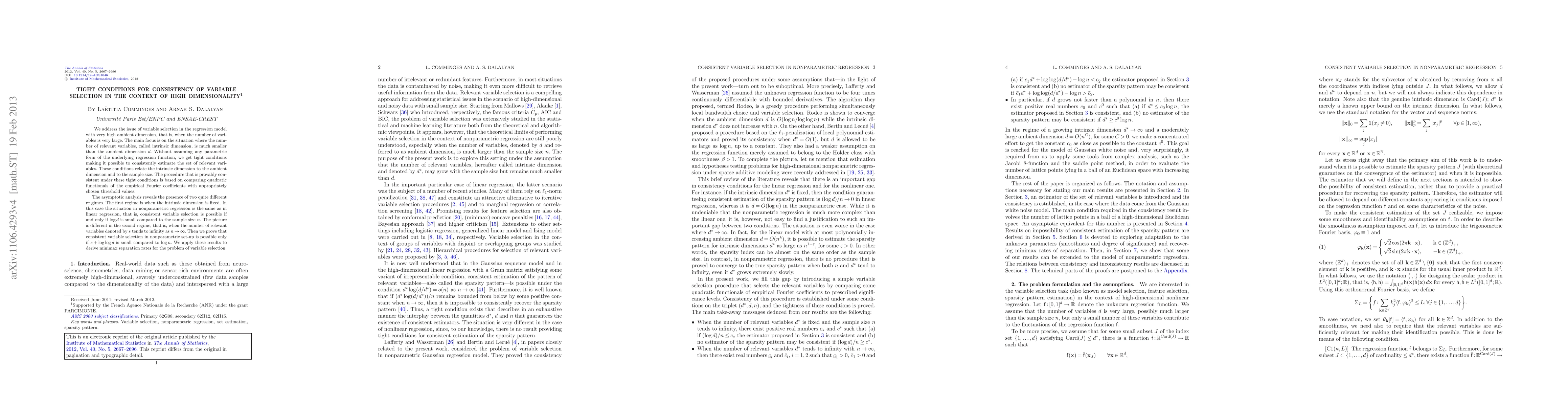 This research paper establishes tight conditions for variable selection in nonparametric regression with high dimensionality, finding that consistent estimation of relevant variables is possible if the intrinsic dimension is small compared to the sample size.