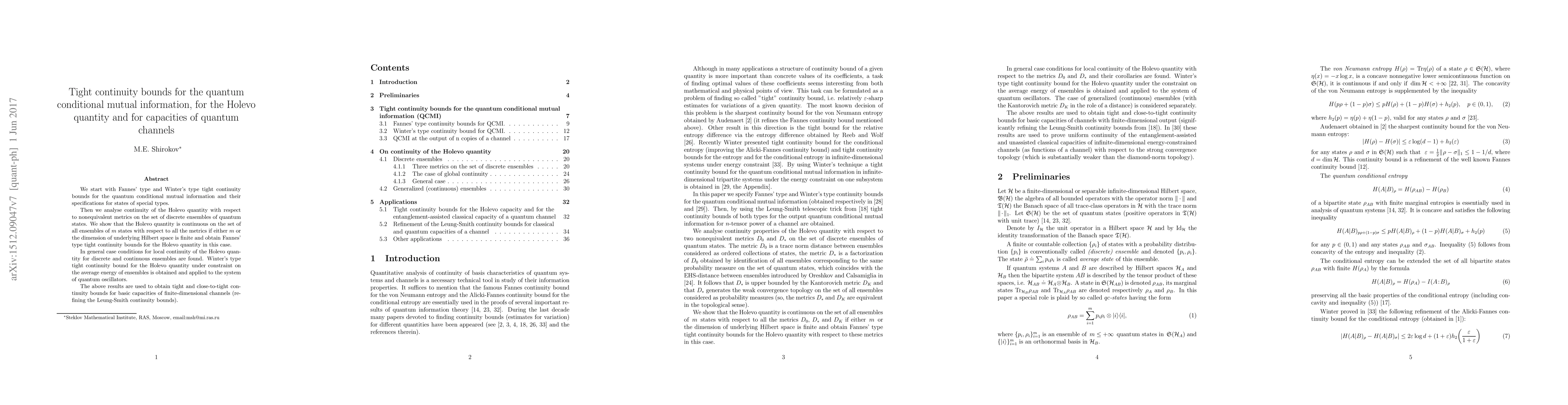 We start with Fannes' type and Winter's type tight continuity bounds for the quantum conditional mutual information and their specifications for states of special types. Then we analyse continuity of the Holevo quantity with respect to nonequivalent metrics on the set of discrete ensembles of quantum states. We show that the Holevo quantity is continuous on the set of all ensembles of m states with respect to all the metrics if either m or the dimension of underlying Hilbert space is finite and obtain Fannes' type tight continuity bounds for the Holevo quantity in this case. In general case conditions for local continuity of the Holevo quantity for discrete and continuous ensembles are found. Winter's type tight continuity bound for the Holevo quantity under constraint on the average energy of ensembles is obtained and applied to the system of quantum oscillators. The above results are used to obtain tight and close-to-tight continuity bounds for basic capacities of finite-dimensional channels (refining the Leung-Smith continuity bounds).
