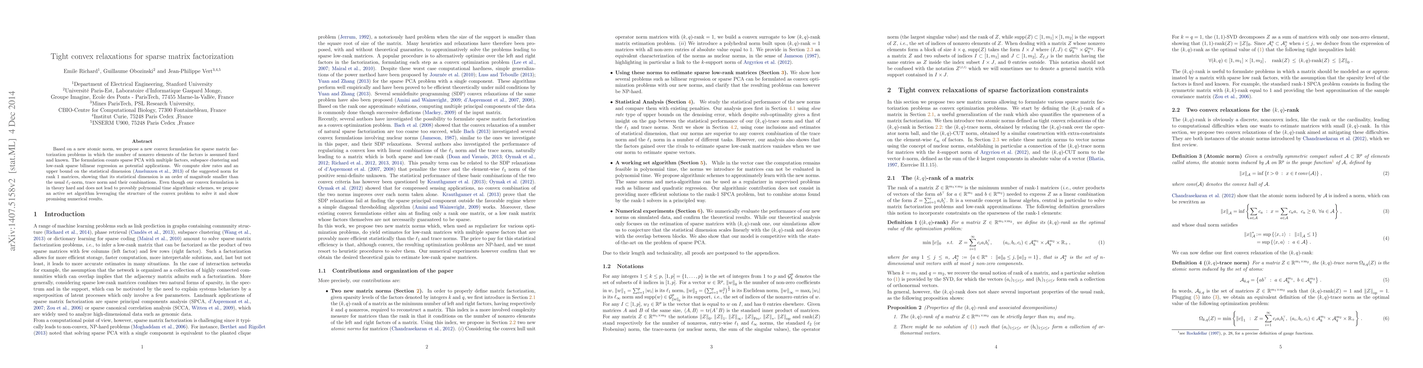 This paper proposes a new convex relaxation for sparse matrix factorization using a new atomic norm, which significantly reduces the statistical dimension compared to traditional norms. The method is applied to sparse PCA, subspace clustering, and low-rank sparse bilinear regression, and an active set algorithm is introduced to solve it, demonstrating promising numerical results.