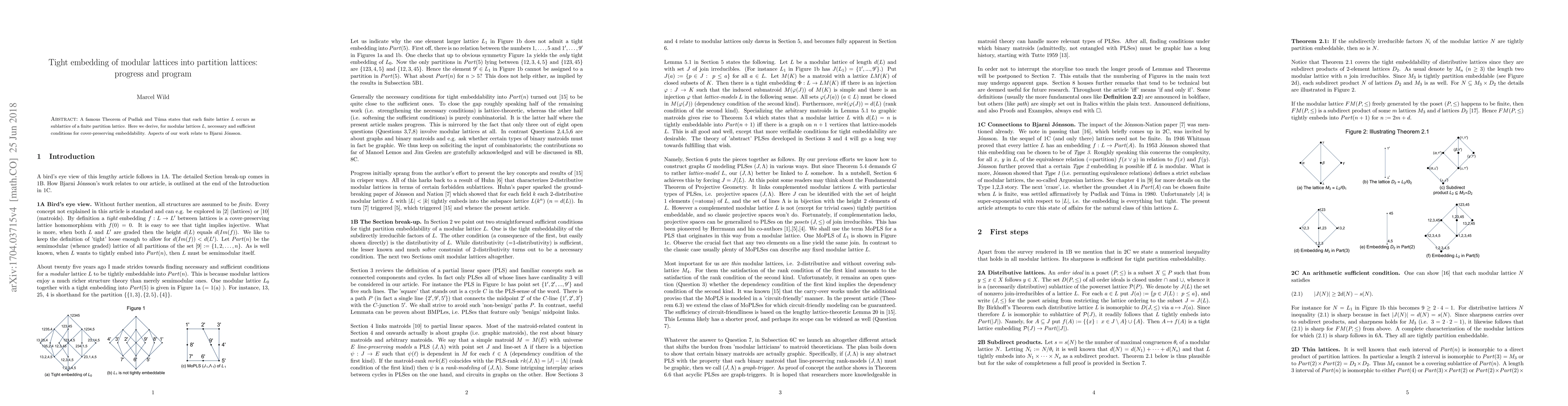 Representing lattices L by equivalence relations amounts to embed them into the lattice Part(V) of all partitions of a set V, and has a long history. Here we are concerned with MODULAR lattices L and aim for sets V as small as possible, i.e. |V| = d(L)+1 where d(L) is the length of L. In other words, we strive for a tight (=cover-preserving) lattice homomorphism from L into Part(V). After a 24 year break the author offers progress, and outlines a program to finally fully characterize the lattices L that admit a tight embedding. Not just 'modular latticians' but also combinatorists are encouraged to contribute. Specifically, eight open questions are posed, four of which purely graph- and matroid-theoretic in nature.