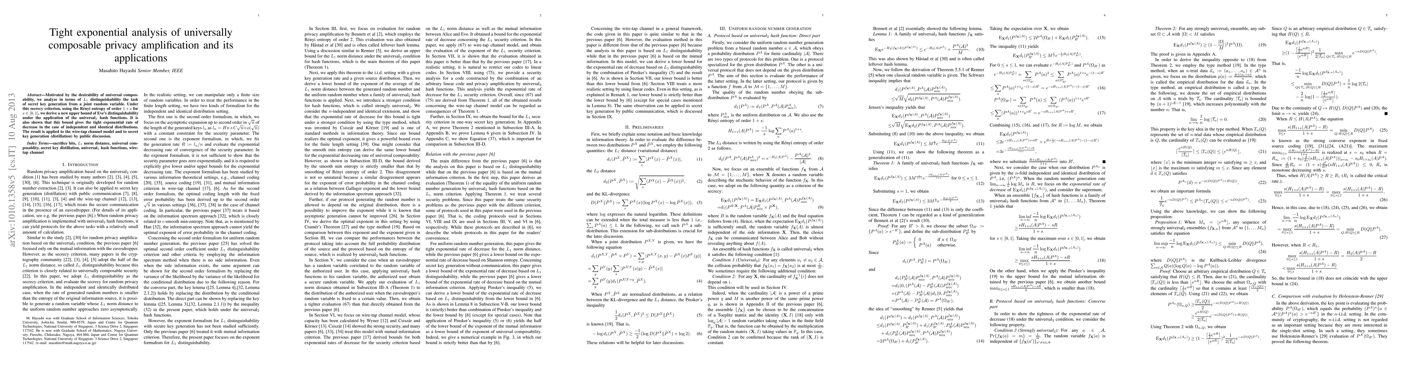 Researchers analyze universal composability in privacy amplification using a new criterion based on L1 distinguishability, deriving an upper bound for Eve's distinguishability under universal hash functions.