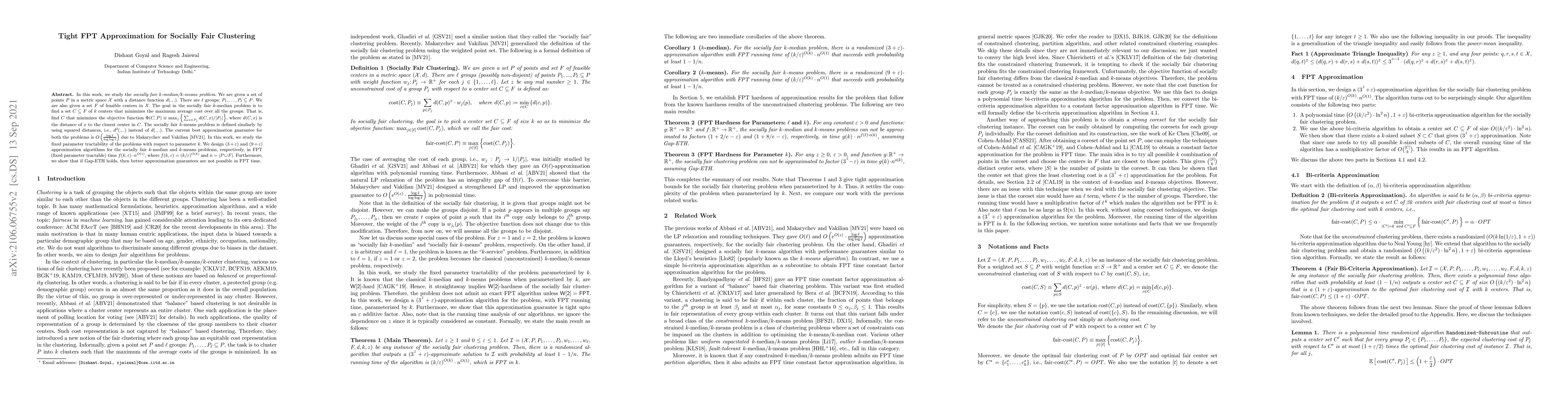 This work contributes to the field by providing the first FPT approximation algorithms for socially fair k-median and k-means, improving upon the previous O(log ℓ / log log ℓ) approximation guarantee and highlighting the complexity of these problems when parameterized by k.