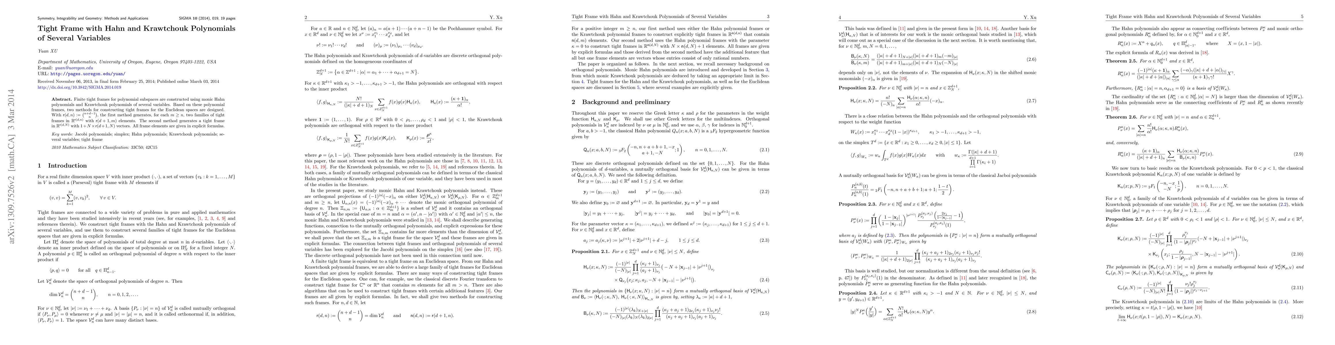 This paper constructs finite tight frames using monic Hahn and Krawtchouk polynomials of several variables, and presents two methods for generating tight frames in Euclidean spaces, providing explicit formulas for the frame elements.