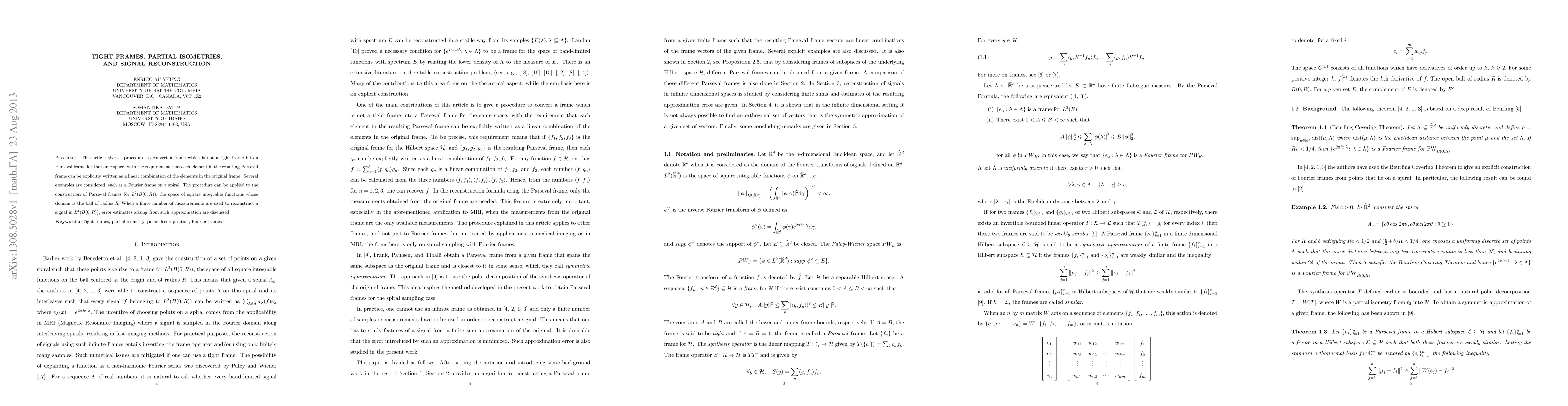 This article gives a procedure to convert a frame which is not a tight frame into a Parseval frame for the same space, with the requirement that each element in the resulting Parseval frame can be explicitly written as a linear combination of the elements in the original frame. Several examples are considered, such as a Fourier frame on a spiral. The procedure can be applied to the construction of Parseval frames for L^2(B(0,R)), the space of square integrable functions whose domain is the ball of radius R. When a finite number of measurements are used to reconstruct a signal in L^2(B(0,R)), error estimates arising from such approximation are discussed.