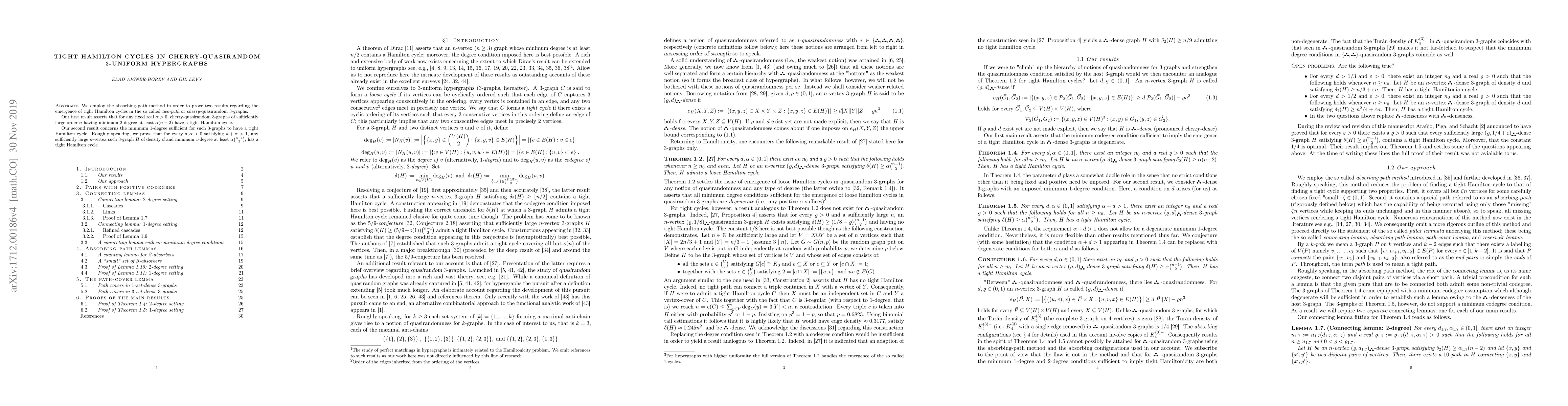 This paper uses the absorbing-path method to demonstrate the existence of tight Hamilton cycles in cherry-quasirandom 3-uniform hypergraphs. It proves that such hypergraphs with a minimum 2-degree of at least α(n-2) contain a tight Hamilton cycle, and also establishes a minimum 1-degree condition for the same result under certain density constraints.