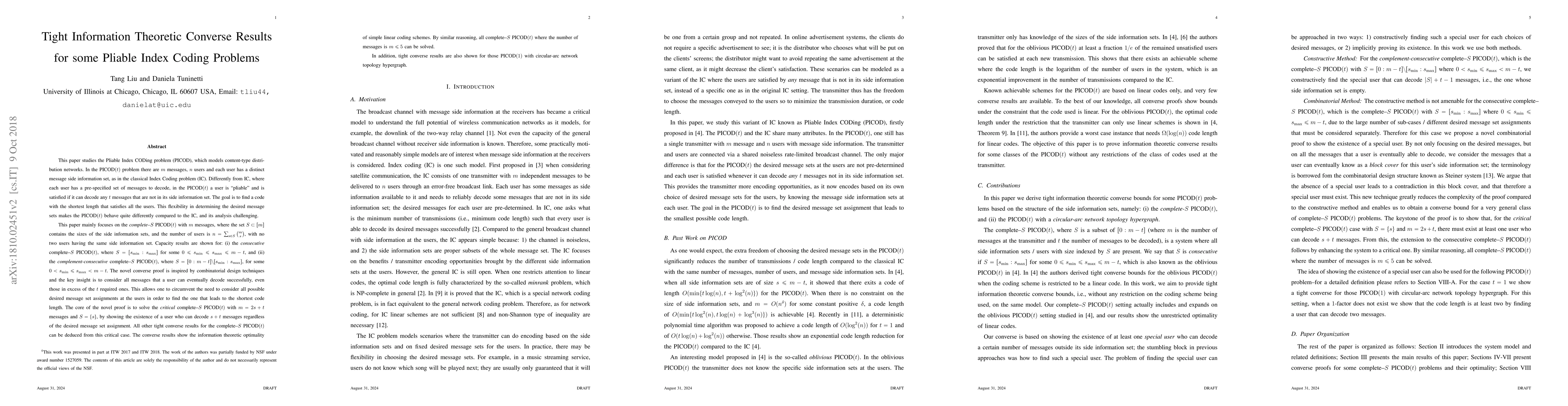 This paper studies the Pliable Index CODing problem (PICOD), which models content-type distribution networks. In the PICOD$(t)$ problem there are $m$ messages, $n$ users and each user has a distinct message side information set, as in the classical Index Coding problem (IC). Differently from IC, where each user has a pre-specified set of messages to decode, in the PICOD$(t)$ a user is "pliable" and is satisfied if it can decode any $t$ messages that are not in its side information set. The goal is to find a code with the shortest length that satisfies all the users. This flexibility in determining the desired message sets makes the PICOD$(t)$ behave quite differently compared to the IC, and its analysis challenging. This paper mainly focuses on the \emph{complete--$S$} PICOD$(t)$ with $m$ messages, where the set $S\subset[m]$ contains the sizes of the side information sets, and the number of users is $n=\sum_{s\in S}\binom{m}{s}$, with no two users having the same side information set. Capacity results are shown for: (i) the \emph{consecutive} complete--$S$ PICOD$(t)$, where $S=[s_{\min}:s_{\max}]$ for some $0 \leq s_{\min} \leq s_{\max} \leq m-t$, and (ii) the \emph{complement-consecutive} complete--$S$ PICOD$(t)$, where $S=[0:m-t]\backslash[s_{\min}:s_{\max}]$, for some $0 < s_{\min} \leq s_{\max} < m-t$. The novel converse proof is inspired by combinatorial design techniques and the key insight is to consider all messages that a user can eventually decode successfully, even those in excess of the $t$ required ones. This allows one to circumvent the need to consider all possible desired message set assignments at the users in order to find the one that leads to the shortest code length. In addition, tight converse results are also shown for those PICOD$(1)$ with circular-arc network topology hypergraph.