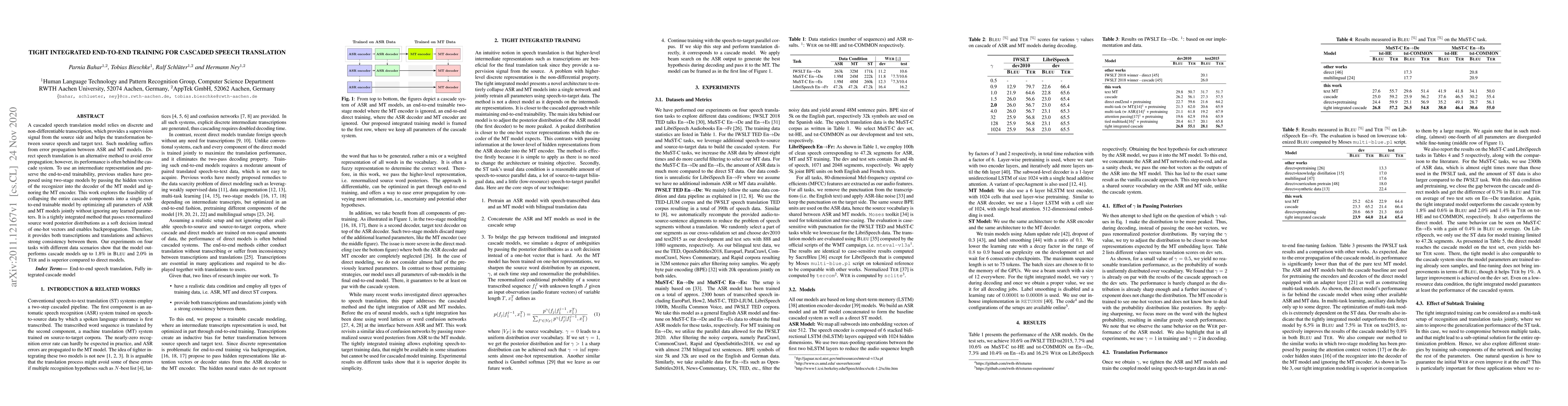 This paper proposes a tightly integrated end-to-end training method for cascaded speech translation, optimizing both ASR and MT models jointly to avoid error propagation. The model passes renormalized source word posteriors, enabling backpropagation and achieving better consistency, outperforming cascade and direct models by up to 1.8% in BLEU and 2.0% in TER.
