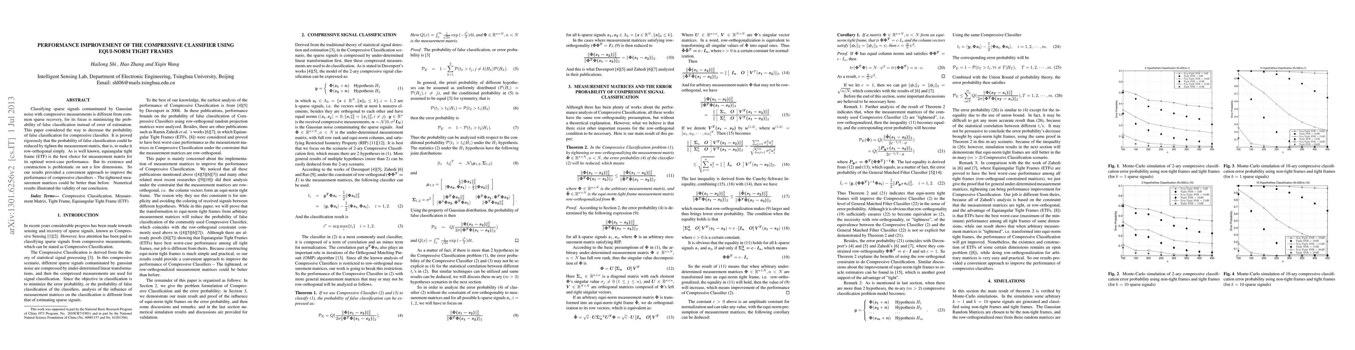 This paper demonstrates that transforming arbitrary sensing matrices into Equi-Norm Tight Frames enhances the performance of Compressive Classifiers, offering a practical method for improved signal detection amidst Gaussian noise. While Equiangular Tight Frames provide optimal worst-case performance, their construction remains challenging, making Equi-Norm Tight Frames a more feasible solution.