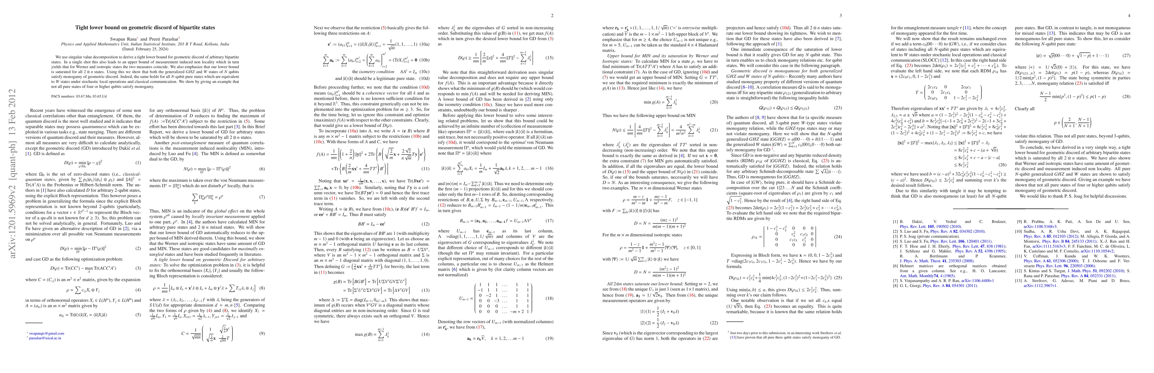 We use singular value decomposition to derive a tight lower bound for geometric discord of arbitrary bipartite states. In a single shot this also leads to an upper bound of measurement-induced non locality which in turn yields that for Werner and isotropic states the two measures coincide. We also emphasize that our lower bound is saturated for all $2\otimes n$ states. Using this we show that both the generalized Greenberger-Horne-Zeilinger and $W$ states of $N$ qubits satisfy monogamy of geometric discord. Indeed, the same holds for all $N$-qubit pure states which are equivalent to $W$ states under stochastic local operations and classical communication. We show by giving an example that not all pure states of four or higher qubits satisfy monogamy.