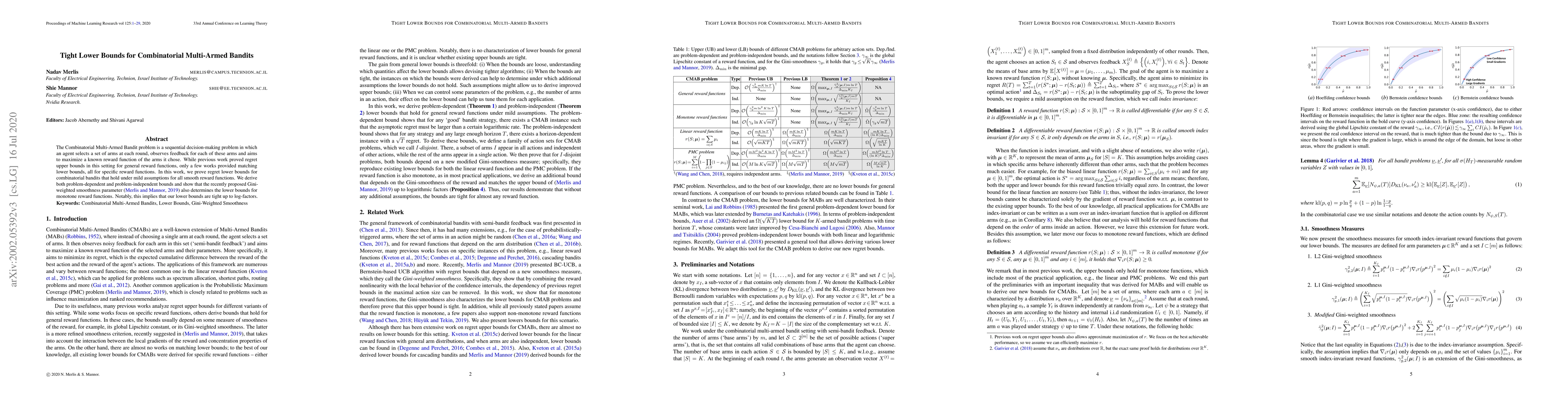 This paper establishes regret lower bounds for the Combinatorial Multi-Armed Bandit problem, demonstrating that previously proposed algorithms are nearly optimal. It provides both problem-dependent and independent bounds for smooth reward functions, showing that the Gini-weighted smoothness parameter is crucial for determining these lower bounds.