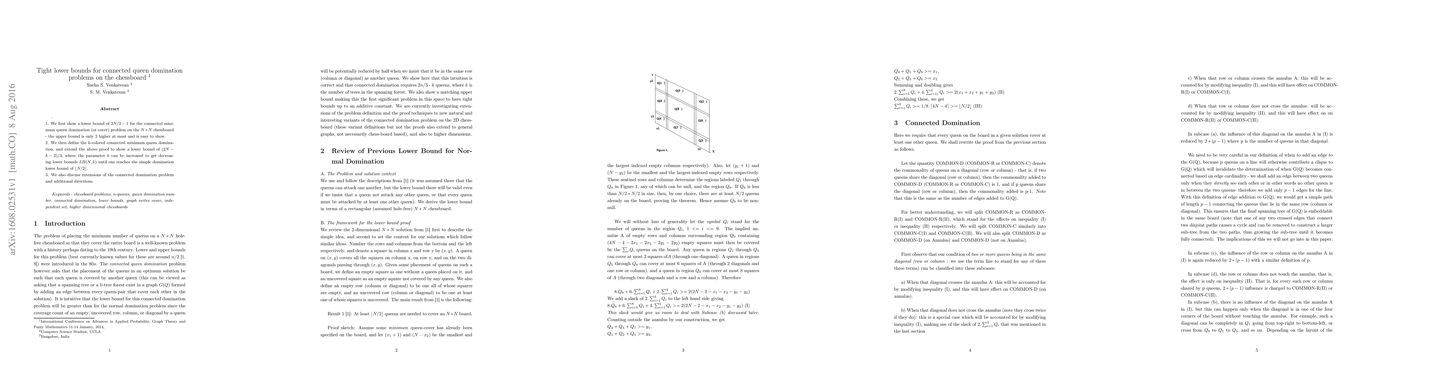 1. We first show a lower bound of 2N/3-1 for the connected minimum queen domination (or cover) problem on the NXN chessboard - the upper bound is only 2 higher at most and is easy to show. 2. We then define the k-colored connected minimum queen domination, and extend the above proof to show a lower bound of (2 N - k - 2)/3, where the parameter k can be increased to get decreasing lower bounds LB(N, k) until one reaches the simple domination lower bound of floor N/2. 3. We also discuss extensions of the connected domination problem and additional directions.
