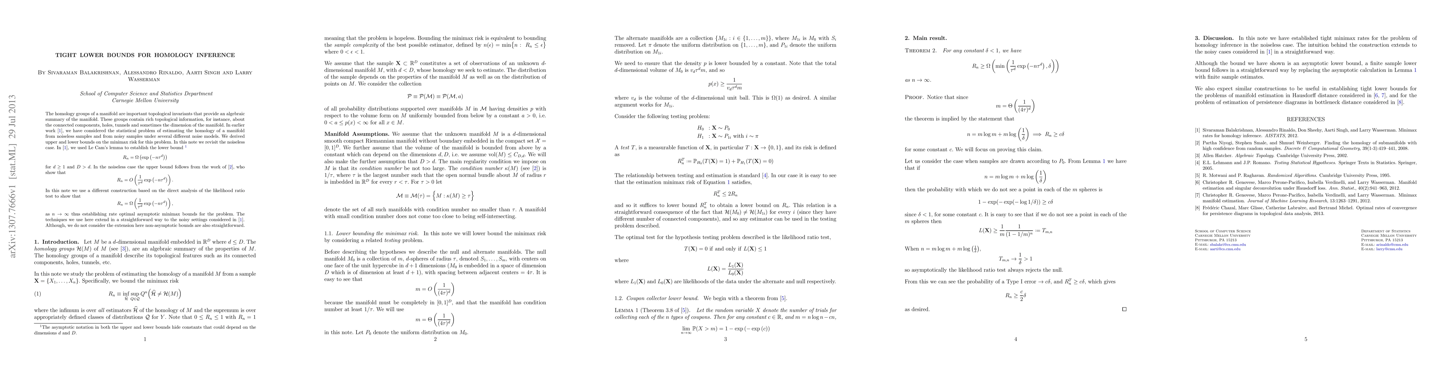 The homology groups of a manifold are important topological invariants that provide an algebraic summary of the manifold. These groups contain rich topological information, for instance, about the connected components, holes, tunnels and sometimes the dimension of the manifold. In earlier work, we have considered the statistical problem of estimating the homology of a manifold from noiseless samples and from noisy samples under several different noise models. We derived upper and lower bounds on the minimax risk for this problem. In this note we revisit the noiseless case. In previous work we used Le Cam's lemma to establish a lower bound that differed from the upper bound of Niyogi, Smale and Weinberger by a polynomial factor in the condition number. In this note we use a different construction based on the direct analysis of the likelihood ratio test to show that the upper bound of Niyogi, Smale and Weinberger is in fact tight, thus establishing rate optimal asymptotic minimax bounds for the problem. The techniques we use here extend in a straightforward way to the noisy settings considered in our earlier work.