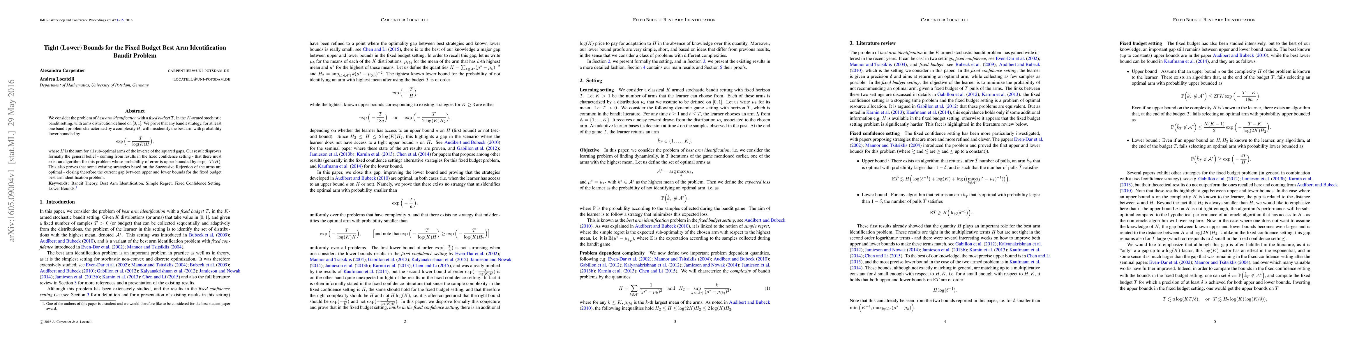 We consider the problem of \textit{best arm identification} with a \textit{fixed budget $T$}, in the $K$-armed stochastic bandit setting, with arms distribution defined on $[0,1]$. We prove that any bandit strategy, for at least one bandit problem characterized by a complexity $H$, will misidentify the best arm with probability lower bounded by $$\exp\Big(-\frac{T}{\log(K)H}\Big),$$ where $H$ is the sum for all sub-optimal arms of the inverse of the squared gaps. Our result disproves formally the general belief - coming from results in the fixed confidence setting - that there must exist an algorithm for this problem whose probability of error is upper bounded by $\exp(-T/H)$. This also proves that some existing strategies based on the Successive Rejection of the arms are optimal - closing therefore the current gap between upper and lower bounds for the fixed budget best arm identification problem.