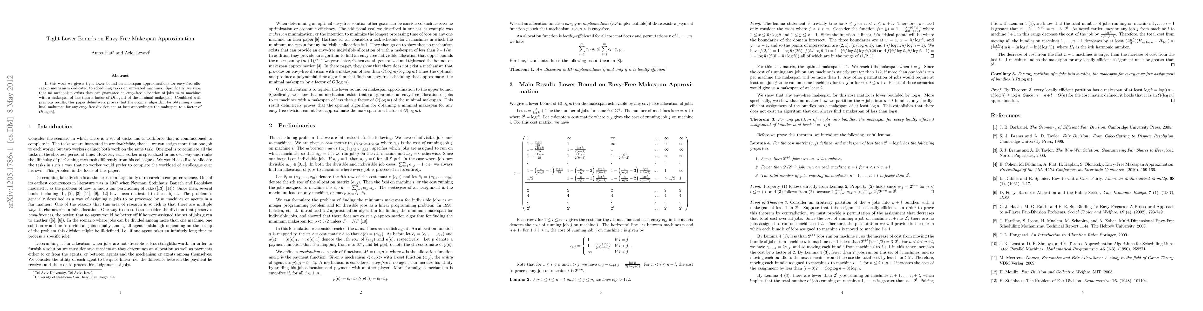 The paper presents a novel lower bound proof for envy-free makespan approximation, tightening existing bounds and establishing a definitive limit on achievable makespan for envy-free mechanisms.