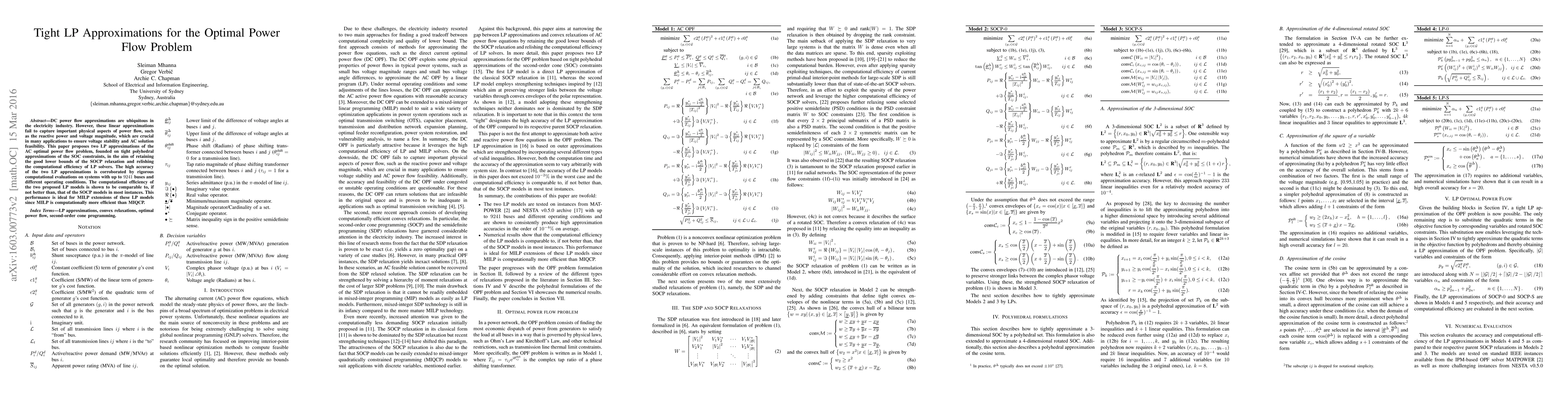 This paper proposes two Linear Programming (LP) approximations for the AC optimal power flow problem, aiming to maintain the accuracy of SOCP relaxations while leveraging the computational efficiency of LP solvers. The proposed LP models achieve high accuracy and computational efficiency, comparable to or better than SOCP models, making them suitable for MILP extensions.
