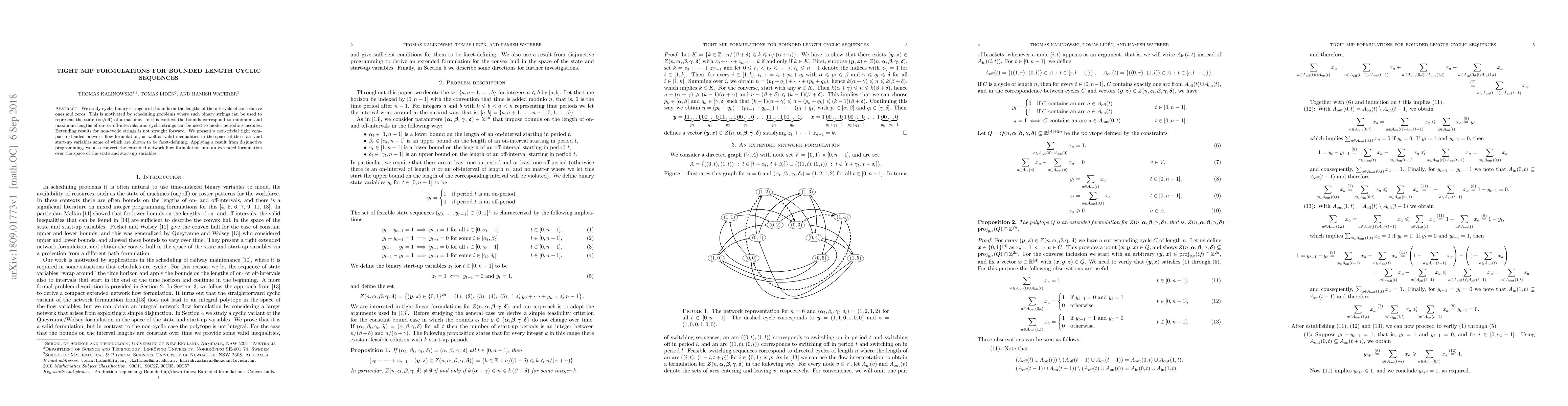 This paper develops tight mixed-integer programming (MIP) formulations for cyclic binary strings with constraints on the lengths of consecutive ones and zeros, relevant for scheduling periodic machine states. It introduces a compact extended network flow formulation and valid inequalities, some of which are facet-defining, and converts it into an extended formulation over state and start-up variables.