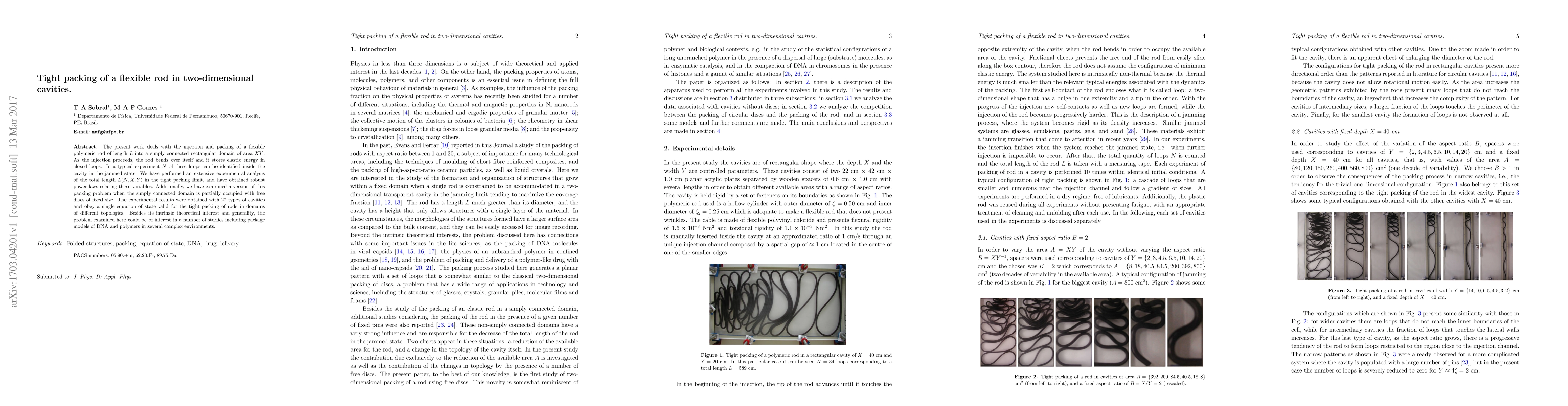 The present work deals with the injection and packing of a flexible polymeric rod of length $L$ into a simply connected rectangular domain of area $XY$. As the injection proceeds, the rod bends over itself and it stores elastic energy in closed loops. In a typical experiment $N$ of these loops can be identified inside the cavity in the jammed state. We have performed an extensive experimental analysis of the total length $L(N, X, Y)$ in the tight packing limit, and have obtained robust power laws relating these variables. Additionally, we have examined a version of this packing problem when the simply connected domain is partially occupied with free discs of fixed size. The experimental results were obtained with 27 types of cavities and obey a single equation of state valid for the tight packing of rods in domains of different topologies. Besides its intrinsic theoretical interest and generality, the problem examined here could be of interest in a number of studies including packing models of DNA and polymers in several complex environments.
