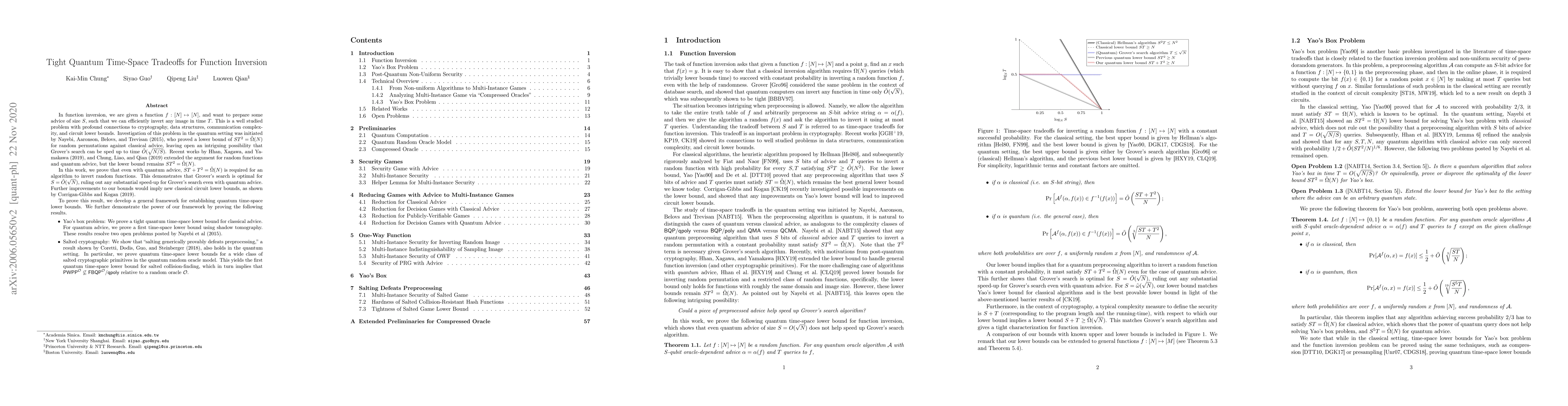In function inversion, we are given a function $f: [N] \mapsto [N]$, and want to prepare some advice of size $S$, such that we can efficiently invert any image in time $T$. This is a well studied problem with profound connections to cryptography, data structures, communication complexity, and circuit lower bounds. Investigation of this problem in the quantum setting was initiated by Nayebi, Aaronson, Belovs, and Trevisan (2015), who proved a lower bound of $ST^2 = \tilde\Omega(N)$ for random permutations against classical advice, leaving open an intriguing possibility that Grover's search can be sped up to time $\tilde O(\sqrt{N/S})$. Recent works by Hhan, Xagawa, and Yamakawa (2019), and Chung, Liao, and Qian (2019) extended the argument for random functions and quantum advice, but the lower bound remains $ST^2 = \tilde\Omega(N)$. In this work, we prove that even with quantum advice, $ST + T^2 = \tilde\Omega(N)$ is required for an algorithm to invert random functions. This demonstrates that Grover's search is optimal for $S = \tilde O(\sqrt{N})$, ruling out any substantial speed-up for Grover's search even with quantum advice. Further improvements to our bounds would imply new classical circuit lower bounds, as shown by Corrigan-Gibbs and Kogan (2019). To prove this result, we develop a general framework for establishing quantum time-space lower bounds. We further demonstrate the power of our framework by proving quantum time-space lower bounds for Yao's box problem and salted cryptography.