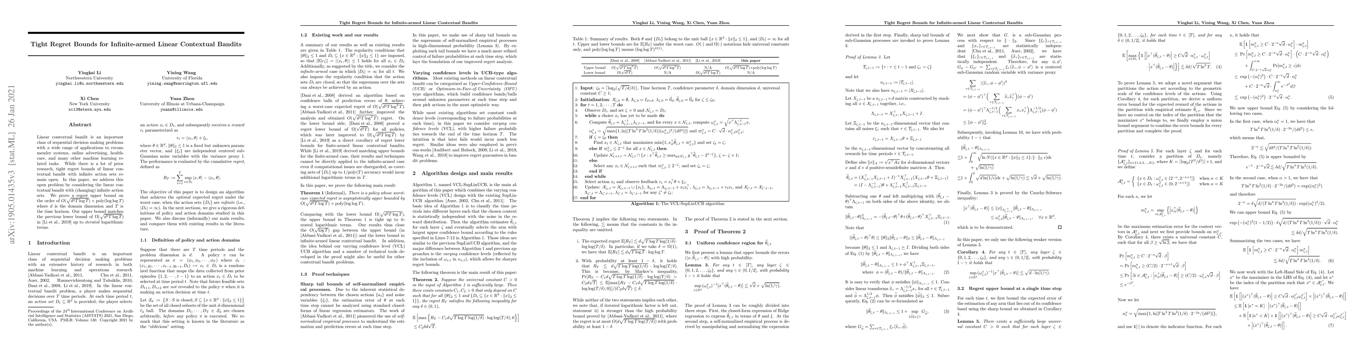 This paper addresses the open problem of tight regret bounds for linear contextual bandits with infinite action sets, proving an upper bound of $O(\sqrt{d^2T\log T})\times \text{poly}(\log\log T)$, which matches the previous lower bound up to iterated logarithmic terms.