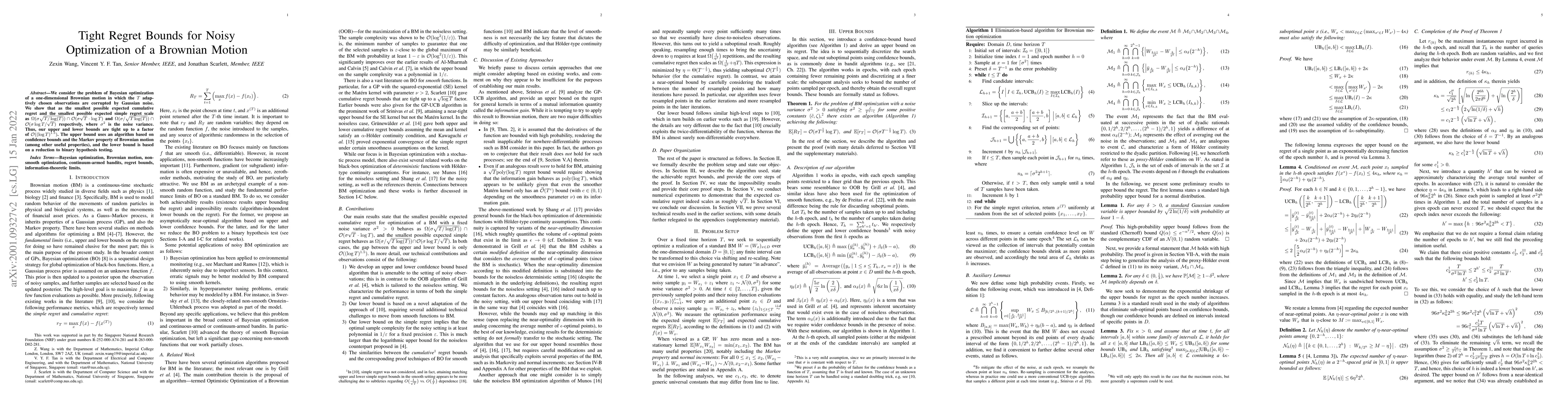 We consider the problem of Bayesian optimization of a one-dimensional Brownian motion in which the $T$ adaptively chosen observations are corrupted by Gaussian noise. We show that as the smallest possible expected cumulative regret and the smallest possible expected simple regret scale as $\Omega(\sigma\sqrt{T / \log (T)}) \cap \mathcal{O}(\sigma\sqrt{T} \cdot \log T)$ and $\Omega(\sigma / \sqrt{T \log (T)}) \cap \mathcal{O}(\sigma\log T / \sqrt{T})$ respectively, where $\sigma^2$ is the noise variance. Thus, our upper and lower bounds are tight up to a factor of $\mathcal{O}( (\log T)^{1.5} )$. The upper bound uses an algorithm based on confidence bounds and the Markov property of Brownian motion (among other useful properties), and the lower bound is based on a reduction to binary hypothesis testing.