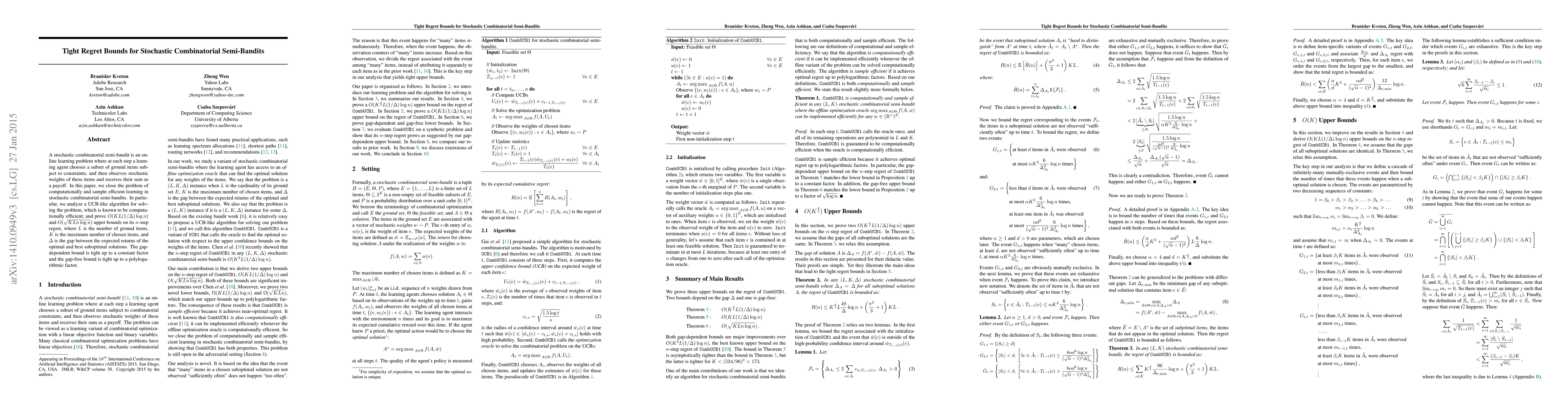 A stochastic combinatorial semi-bandit is an online learning problem where at each step a learning agent chooses a subset of ground items subject to constraints, and then observes stochastic weights of these items and receives their sum as a payoff. In this paper, we close the problem of computationally and sample efficient learning in stochastic combinatorial semi-bandits. In particular, we analyze a UCB-like algorithm for solving the problem, which is known to be computationally efficient; and prove $O(K L (1 / \Delta) \log n)$ and $O(\sqrt{K L n \log n})$ upper bounds on its $n$-step regret, where $L$ is the number of ground items, $K$ is the maximum number of chosen items, and $\Delta$ is the gap between the expected returns of the optimal and best suboptimal solutions. The gap-dependent bound is tight up to a constant factor and the gap-free bound is tight up to a polylogarithmic factor.