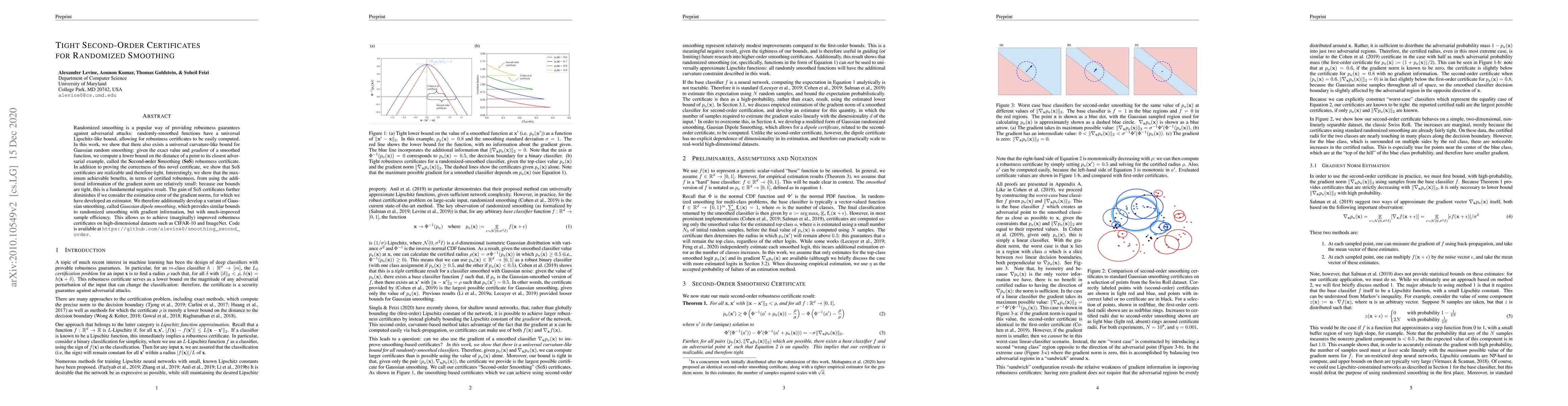 Randomized smoothing is a popular way of providing robustness guarantees against adversarial attacks: randomly-smoothed functions have a universal Lipschitz-like bound, allowing for robustness certificates to be easily computed. In this work, we show that there also exists a universal curvature-like bound for Gaussian random smoothing: given the exact value and gradient of a smoothed function, we compute a lower bound on the distance of a point to its closest adversarial example, called the Second-order Smoothing (SoS) robustness certificate. In addition to proving the correctness of this novel certificate, we show that SoS certificates are realizable and therefore tight. Interestingly, we show that the maximum achievable benefits, in terms of certified robustness, from using the additional information of the gradient norm are relatively small: because our bounds are tight, this is a fundamental negative result. The gain of SoS certificates further diminishes if we consider the estimation error of the gradient norms, for which we have developed an estimator. We therefore additionally develop a variant of Gaussian smoothing, called Gaussian dipole smoothing, which provides similar bounds to randomized smoothing with gradient information, but with much-improved sample efficiency. This allows us to achieve (marginally) improved robustness certificates on high-dimensional datasets such as CIFAR-10 and ImageNet. Code is available at https://github.com/alevine0/smoothing_second_order.
