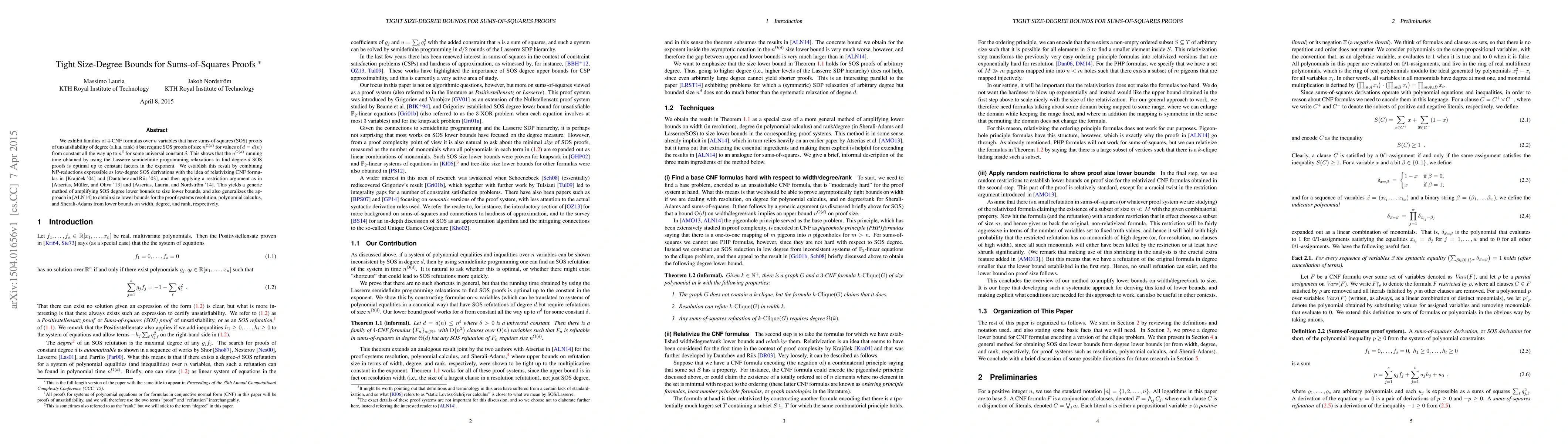 We exhibit families of $4$-CNF formulas over $n$ variables that have sums-of-squares (SOS) proofs of unsatisfiability of degree (a.k.a. rank) $d$ but require SOS proofs of size $n^{\Omega(d)}$ for values of $d = d(n)$ from constant all the way up to $n^{\delta}$ for some universal constant$\delta$. This shows that the $n^{O(d)}$ running time obtained by using the Lasserre semidefinite programming relaxations to find degree-$d$ SOS proofs is optimal up to constant factors in the exponent. We establish this result by combining $\mathsf{NP}$-reductions expressible as low-degree SOS derivations with the idea of relativizing CNF formulas in [Kraj\'i\v{c}ek '04] and [Dantchev and Riis'03], and then applying a restriction argument as in [Atserias, M\"uller, and Oliva '13] and [Atserias, Lauria, and Nordstr\"om '14]. This yields a generic method of amplifying SOS degree lower bounds to size lower bounds, and also generalizes the approach in [ALN14] to obtain size lower bounds for the proof systems resolution, polynomial calculus, and Sherali-Adams from lower bounds on width, degree, and rank, respectively.