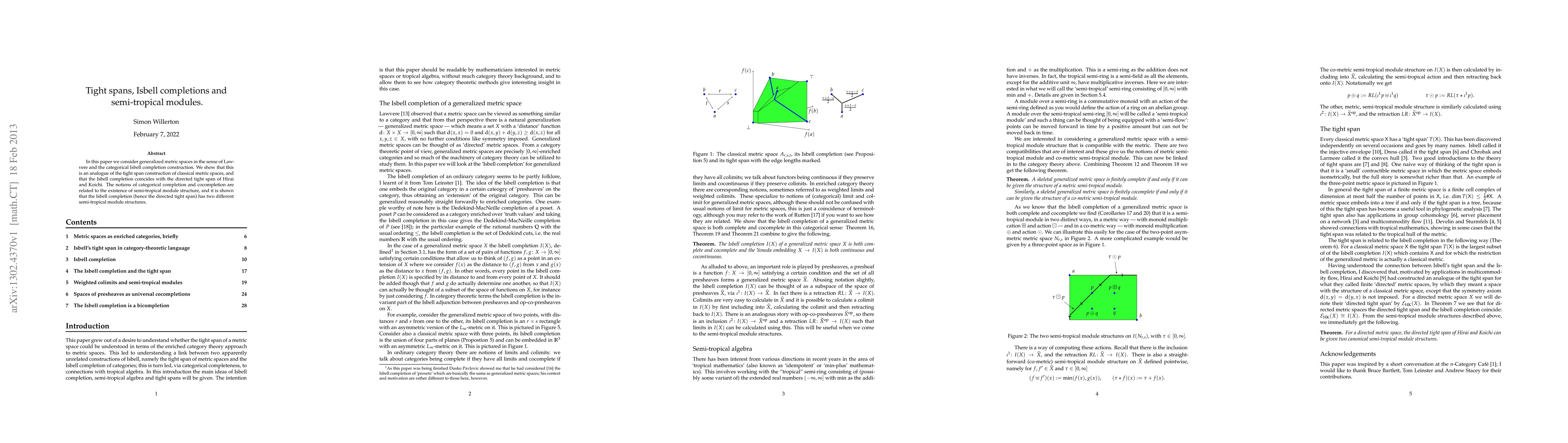 This paper investigates the categorical Isbell completion for generalized metric spaces, demonstrating its equivalence to the classical tight span construction and relating it to the directed tight span. It also explores the connection between these completions and the existence of semi-tropical module structures, revealing two distinct semi-tropical module structures for the Isbell completion.