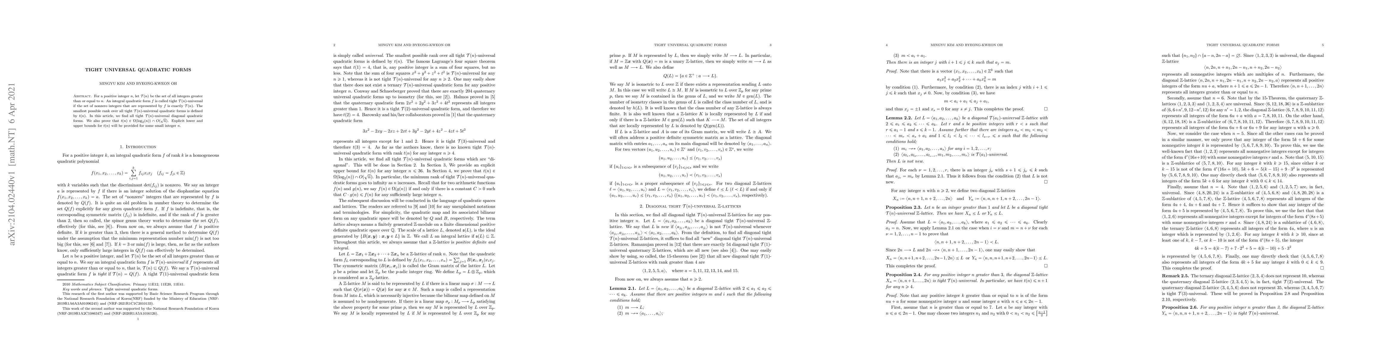 This paper identifies all diagonal quadratic forms that are tight $\mathcal T(n)$-universal, meaning they represent exactly the integers greater than or equal to $n$. It establishes that the smallest rank of such forms, denoted $t(n)$, satisfies $t(n) \in \Omega(\log_2(n)) \cap O(\sqrt{n})$, with explicit bounds provided for small values of $n$.