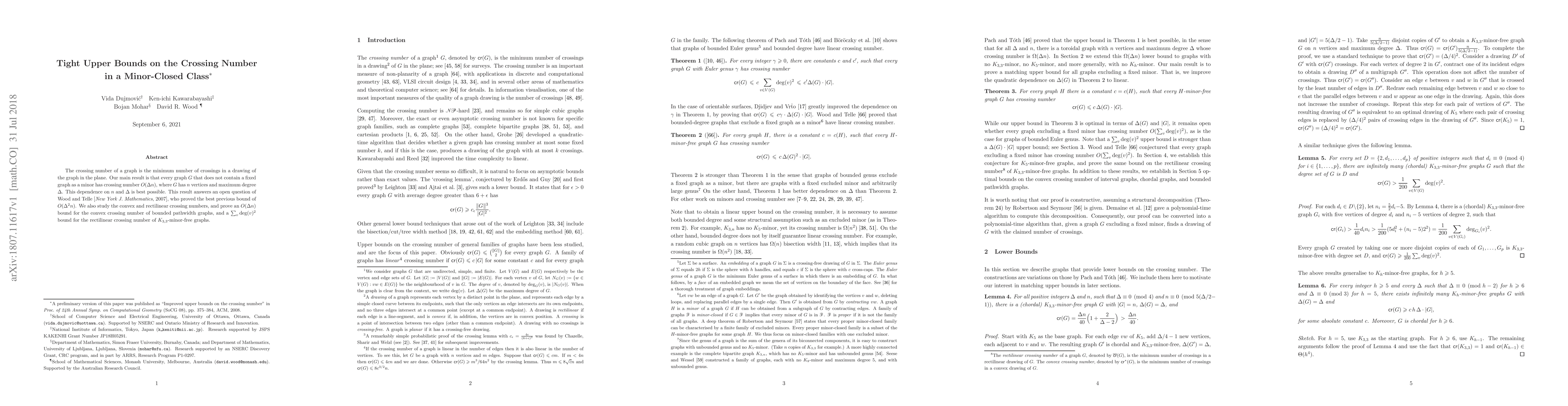 The crossing number of a graph is the minimum number of crossings in a drawing of the graph in the plane. Our main result is that every graph $G$ that does not contain a fixed graph as a minor has crossing number $O(\Delta n)$, where $G$ has $n$ vertices and maximum degree $\Delta$. This dependence on $n$ and $\Delta$ is best possible. This result answers an open question of Wood and Telle [New York J. Mathematics, 2007], who proved the best previous bound of $O(\Delta^2 n)$. We also study the convex and rectilinear crossing numbers, and prove an $O(\Delta n)$ bound for the convex crossing number of bounded pathwidth graphs, and a $\sum_v\deg(v)^2$ bound for the rectilinear crossing number of $K_{3,3}$-minor-free graphs.