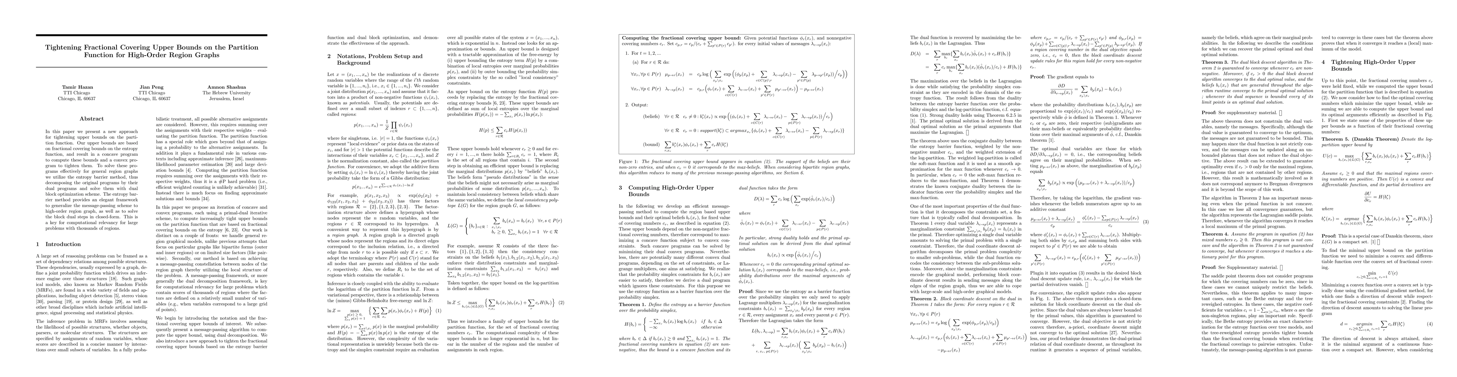 This paper introduces a novel method for improving upper bounds on the partition function using fractional covering bounds and entropy functions, resulting in a concave program and a convex program. The entropy barrier method is employed to efficiently solve these programs for high-order region graphs, enabling closed-form solutions for large-scale problems.