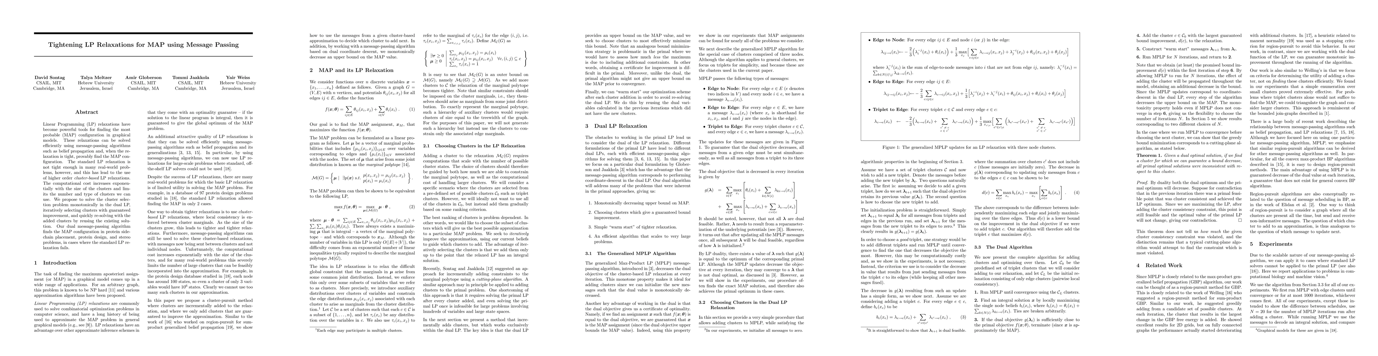 This paper proposes a dual message-passing algorithm to iteratively select and add higher-order clusters in LP relaxations, improving tightness and solving MAP configurations in graphical models where standard LP relaxations fail. The method efficiently reuses existing solutions to quickly re-solve with added clusters, demonstrating effectiveness in protein sidechain placement, protein design, and stereo problems.