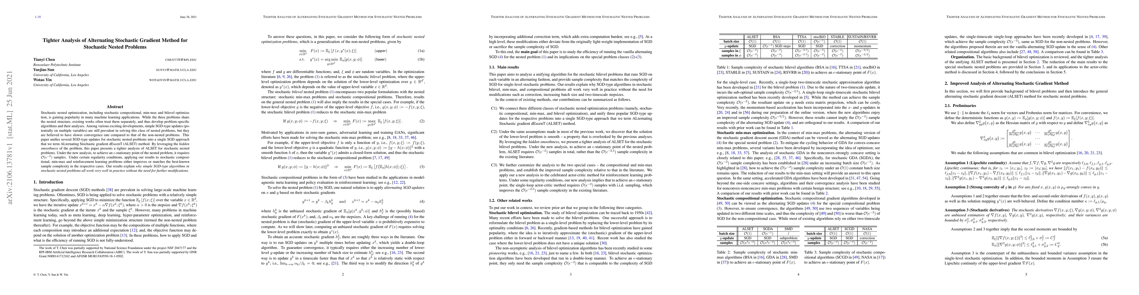 Stochastic nested optimization, including stochastic compositional, min-max and bilevel optimization, is gaining popularity in many machine learning applications. While the three problems share the nested structure, existing works often treat them separately, and thus develop problem-specific algorithms and their analyses. Among various exciting developments, simple SGD-type updates (potentially on multiple variables) are still prevalent in solving this class of nested problems, but they are believed to have slower convergence rate compared to that of the non-nested problems. This paper unifies several SGD-type updates for stochastic nested problems into a single SGD approach that we term ALternating Stochastic gradient dEscenT (ALSET) method. By leveraging the hidden smoothness of the problem, this paper presents a tighter analysis of ALSET for stochastic nested problems. Under the new analysis, to achieve an $\epsilon$-stationary point of the nested problem, it requires ${\cal O}(\epsilon^{-2})$ samples. Under certain regularity conditions, applying our results to stochastic compositional, min-max and reinforcement learning problems either improves or matches the best-known sample complexity in the respective cases. Our results explain why simple SGD-type algorithms in stochastic nested problems all work very well in practice without the need for further modifications.