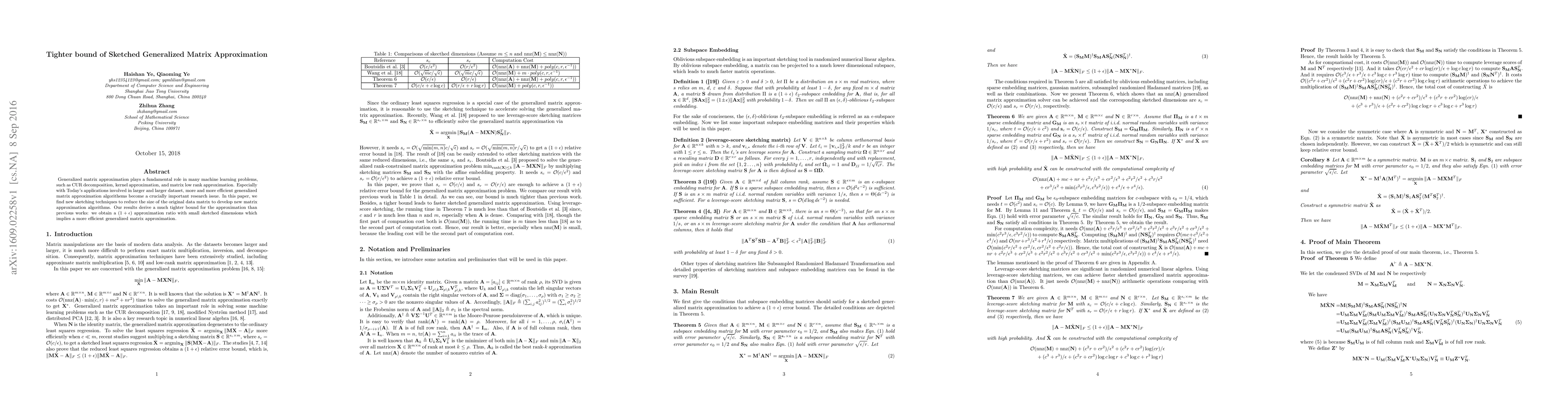 This paper introduces novel sketching techniques to develop more efficient generalized matrix approximation algorithms, achieving a tighter $(1+\epsilon)$ approximation ratio with reduced sketched dimensions compared to previous methods. The new results imply significant improvements in handling large-scale datasets in machine learning applications.