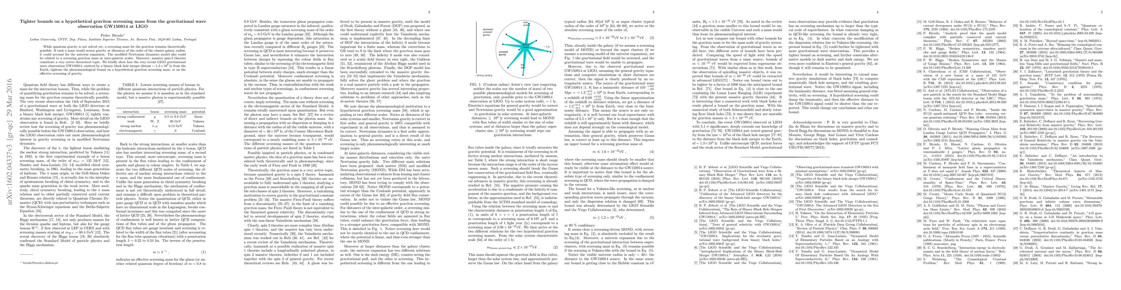 While quantum gravity is not solved yet, a screening mass for the graviton remains theoretically possible. If such a mass would screen gravity at distances of the order of the cluster galaxy radius, it could account for the universe expansion. The modified Newtonian dynamics model also could be related to a screening graviton mass at inter-galactic scales. Moreover, massive spin-2 theories constitute a very active theoretical topic. We briefly show how the very recent LIGO gravitational wave observation GW150914, emitted by a binary black hole merger distant $\sim 1.3 \times 10^9$ ly from the Earth, tightens the phenomenological bound on a massive graviton or on the screening of gravity.