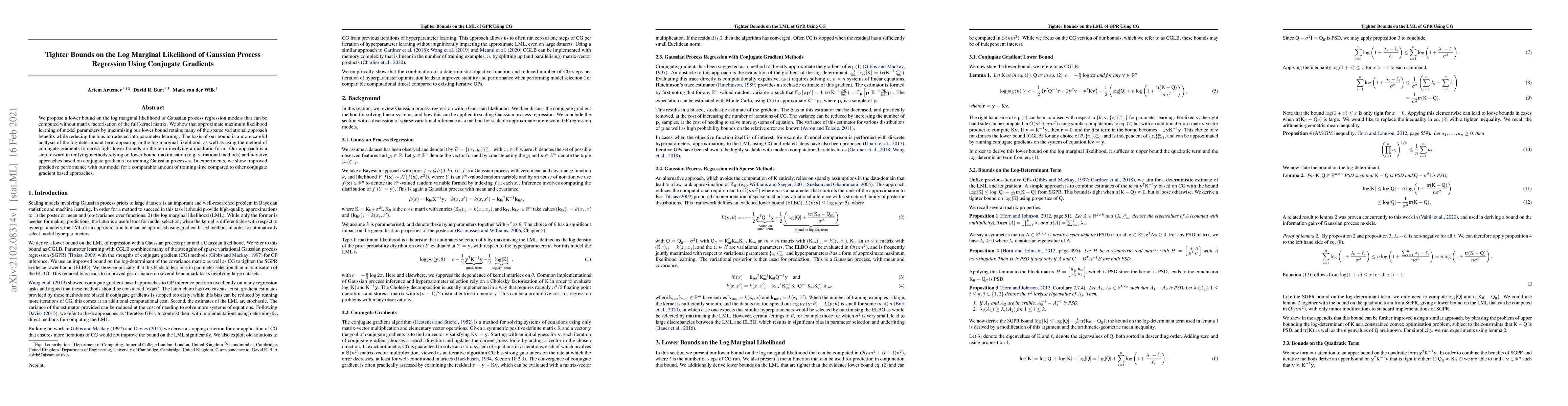 This paper proposes a lower bound on the log marginal likelihood for Gaussian process regression that can be computed without full matrix factorization, leveraging conjugate gradients. This approach maintains sparse variational benefits while reducing parameter learning bias, demonstrating improved predictive performance with similar training times.