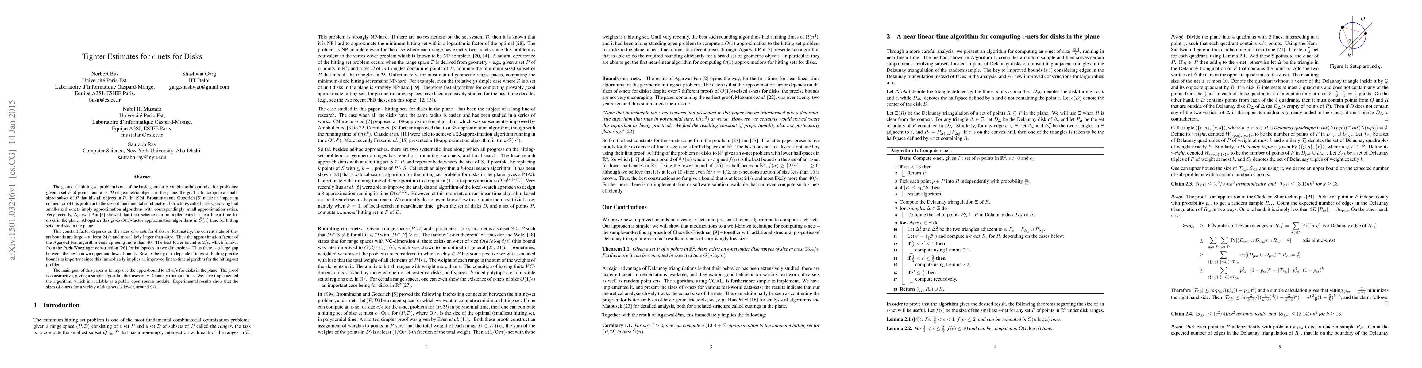 The geometric hitting set problem is one of the basic geometric combinatorial optimization problems: given a set $P$ of points, and a set $\mathcal{D}$ of geometric objects in the plane, the goal is to compute a small-sized subset of $P$ that hits all objects in $\mathcal{D}$. In 1994, Bronniman and Goodrich made an important connection of this problem to the size of fundamental combinatorial structures called $\epsilon$-nets, showing that small-sized $\epsilon$-nets imply approximation algorithms with correspondingly small approximation ratios. Very recently, Agarwal and Pan showed that their scheme can be implemented in near-linear time for disks in the plane. Altogether this gives $O(1)$-factor approximation algorithms in $\tilde{O}(n)$ time for hitting sets for disks in the plane. This constant factor depends on the sizes of $\epsilon$-nets for disks; unfortunately, the current state-of-the-art bounds are large -- at least $24/\epsilon$ and most likely larger than $40/\epsilon$. Thus the approximation factor of the Agarwal and Pan algorithm ends up being more than $40$. The best lower-bound is $2/\epsilon$, which follows from the Pach-Woeginger construction for halfspaces in two dimensions. Thus there is a large gap between the best-known upper and lower bounds. Besides being of independent interest, finding precise bounds is important since this immediately implies an improved linear-time algorithm for the hitting-set problem. The main goal of this paper is to improve the upper-bound to $13.4/\epsilon$ for disks in the plane. The proof is constructive, giving a simple algorithm that uses only Delaunay triangulations. We have implemented the algorithm, which is available as a public open-source module. Experimental results show that the sizes of $\epsilon$-nets for a variety of data-sets is lower, around $9/\epsilon$.