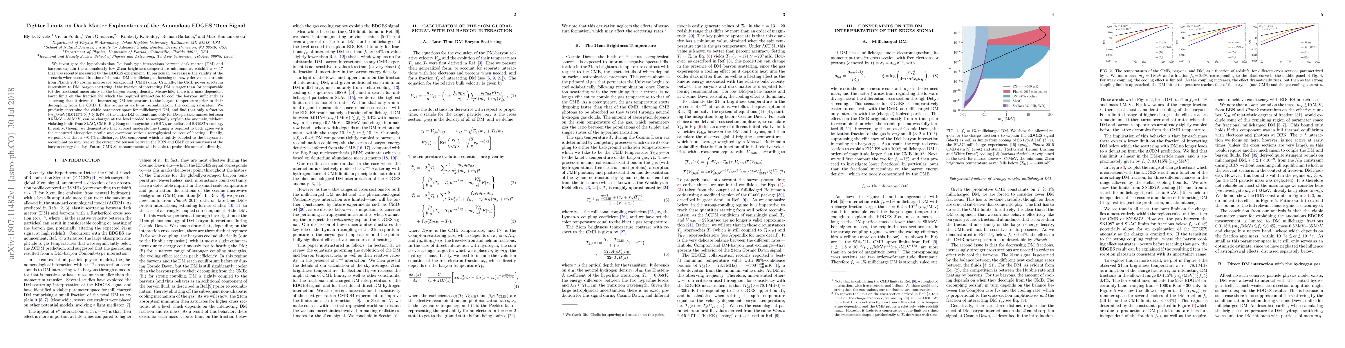 We investigate the hypothesis that Coulomb-type interactions between dark matter (DM) and baryons explain the anomalously low 21cm brightness-temperature minimum at redshift z ~ 17 that was recently measured by the EDGES experiment. In particular, we reassess the validity of the scenario where a small fraction of the total DM is millicharged, focusing on newly derived constraints from Planck 2015 cosmic microwave background (CMB) data. Crucially, the CMB power spectrum is sensitive to DM-baryon scattering if the fraction of interacting DM is larger than (or comparable to) the fractional uncertainty in the baryon energy density. Meanwhile, there is a mass-dependent lower limit on the fraction for which the required interaction to cool the baryons sufficiently is so strong that it drives the interacting-DM temperature to the baryon temperature prior to their decoupling from the CMB. If this occurs as early as recombination, the cooling saturates. We precisely determine the viable parameter space for millicharged DM, and find that only a fraction (m_chi/MeV) 0.0115% <~ f <~ 0.4% of the entire DM content, and only for DM-particle masses between 0.5 MeV - 35 MeV, can be charged at the level needed to marginally explain the anomaly, without violating limits from SLAC, CMB, Big-Bang nucleosynthesis (BBN), or stellar and SN1987A cooling. In reality, though, we demonstrate that at least moderate fine tuning is required to both agree with the measured absorption profile and overcome various astrophysical sources of heating. Finally, we point out that a ~0.4% millicharged DM component which is tightly coupled to the baryons at recombination may resolve the current 2-sigma tension between the BBN and CMB determinations of the baryon energy density. Future CMB-S4 measurements will be able to probe this scenario directly.