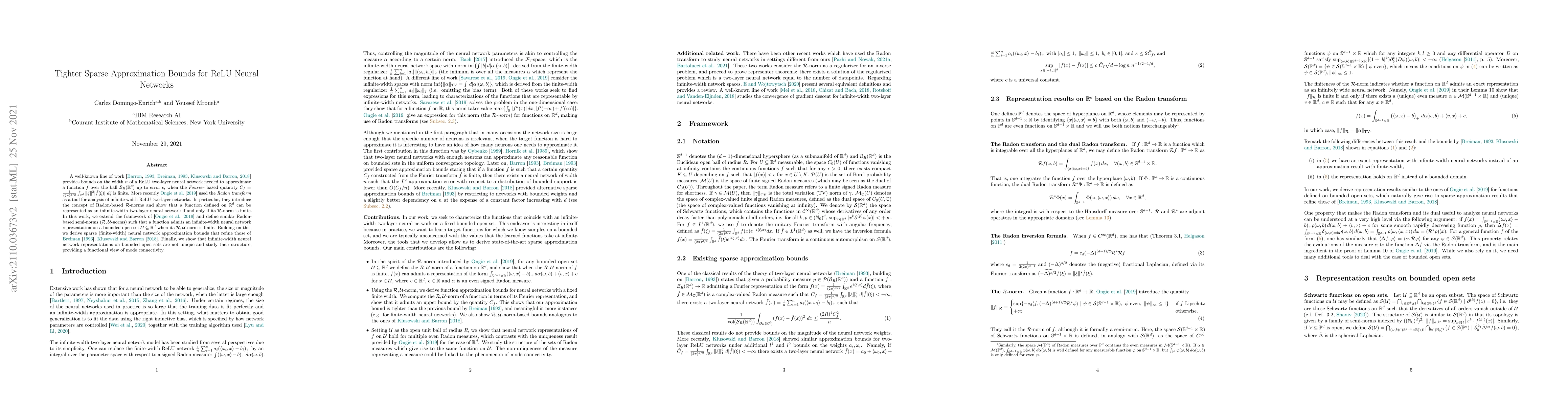 A well-known line of work (Barron, 1993; Breiman, 1993; Klusowski & Barron, 2018) provides bounds on the width $n$ of a ReLU two-layer neural network needed to approximate a function $f$ over the ball $\mathcal{B}_R(\mathbb{R}^d)$ up to error $\epsilon$, when the Fourier based quantity $C_f = \frac{1}{(2\pi)^{d/2}} \int_{\mathbb{R}^d} \|\xi\|^2 |\hat{f}(\xi)| \ d\xi$ is finite. More recently Ongie et al. (2019) used the Radon transform as a tool for analysis of infinite-width ReLU two-layer networks. In particular, they introduce the concept of Radon-based $\mathcal{R}$-norms and show that a function defined on $\mathbb{R}^d$ can be represented as an infinite-width two-layer neural network if and only if its $\mathcal{R}$-norm is finite. In this work, we extend the framework of Ongie et al. (2019) and define similar Radon-based semi-norms ($\mathcal{R}, \mathcal{U}$-norms) such that a function admits an infinite-width neural network representation on a bounded open set $\mathcal{U} \subseteq \mathbb{R}^d$ when its $\mathcal{R}, \mathcal{U}$-norm is finite. Building on this, we derive sparse (finite-width) neural network approximation bounds that refine those of Breiman (1993); Klusowski & Barron (2018). Finally, we show that infinite-width neural network representations on bounded open sets are not unique and study their structure, providing a functional view of mode connectivity.
