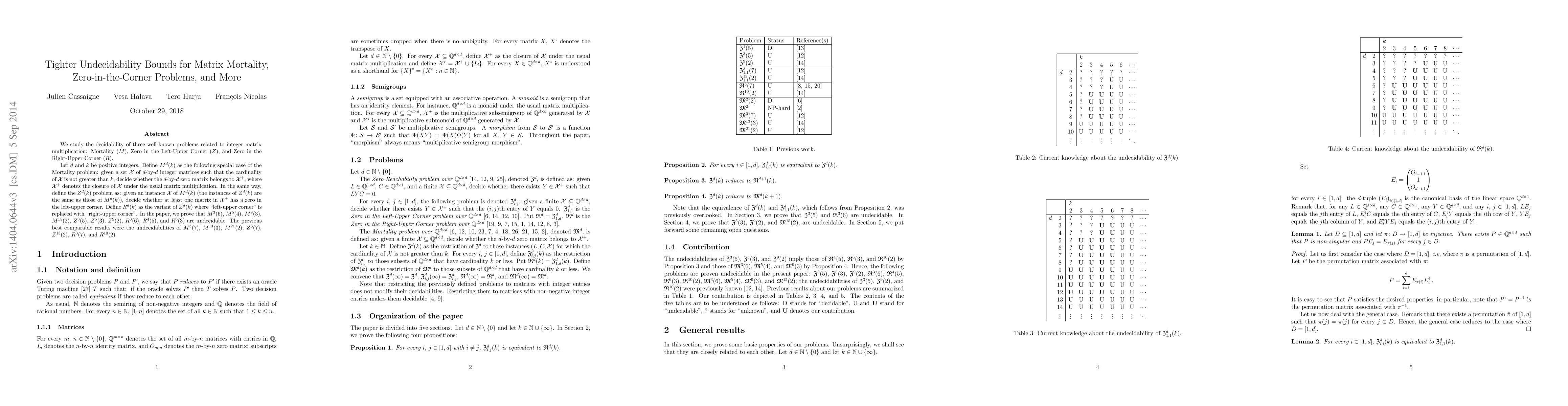 We study the decidability of three well-known problems related to integer matrix multiplication: Mortality (M), Zero in the Left-Upper Corner (Z), and Zero in the Right-Upper Corner (R). Let d and k be positive integers. Define M(k, d x d) as the following special case of the Mortality problem: given a set X of d -by-d integer matrices such that the cardinality of X is not greater than k, decide whether the d-by-d zero matrix belongs to X^+, where X^+ denotes the closure of X under the usual matrix multiplication. In the same way, define the Z(k, d x d) problem as: given an instance X of M(k, d x d) (the instances of Z(k, d x d) are the same as those of M(k, d x d)), decide whether at least one matrix in X^+ has a zero in the left-upper corner. Define R(k, d x d) as the variant of Z(k, d x d) where "left-upper corner" is replaced with "right-upper corner". In the paper, we prove that M(6, 3 x 3), M(4, 5 x 5), M(3, 9 x 9), M(2, 15 x 15), Z(5, 3 x 3), Z(3, 5 x 5), Z(2, 9 x 9), R(6, 3 x 3), R(5, 4 x 4), and R(3, 6 x 6) are undecidable. The previous best comparable results were the undecidabilities of M(7, 3 x 3), M(3, 13 x 13), M(2, 21 x 21), Z(7, 3 x 3), Z(2, 13 x 13), R(7, 3 x 3), and R(2, 10 x 10).