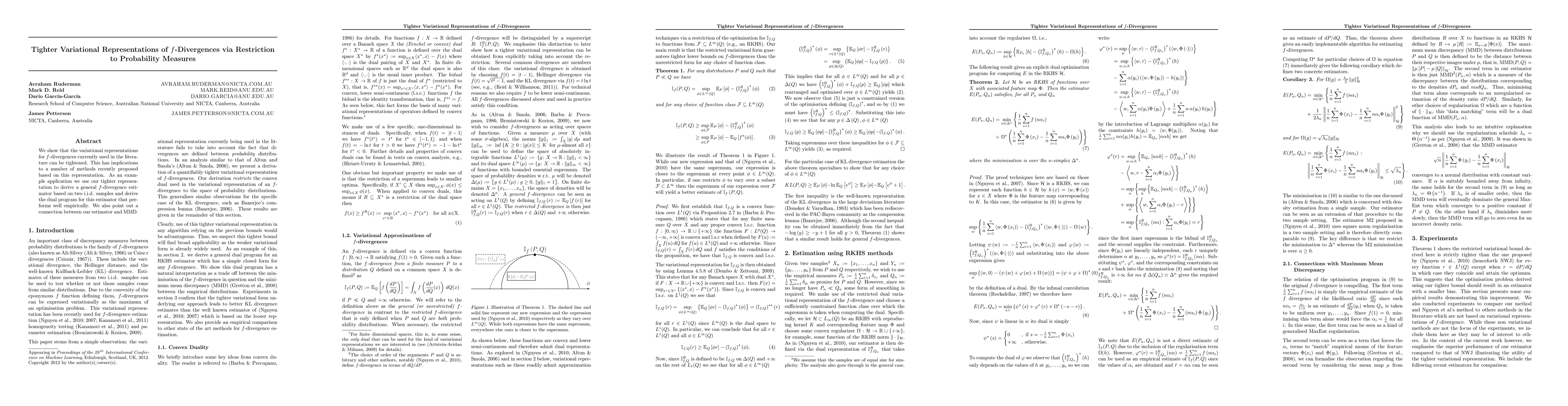 This paper presents tighter variational representations for f-divergences, improving upon existing methods. An application of this tighter representation leads to a new f-divergence estimator based on two i.i.d. samples, with an empirically effective dual program, and highlights a connection to Maximum Mean Discrepancy (MMD).