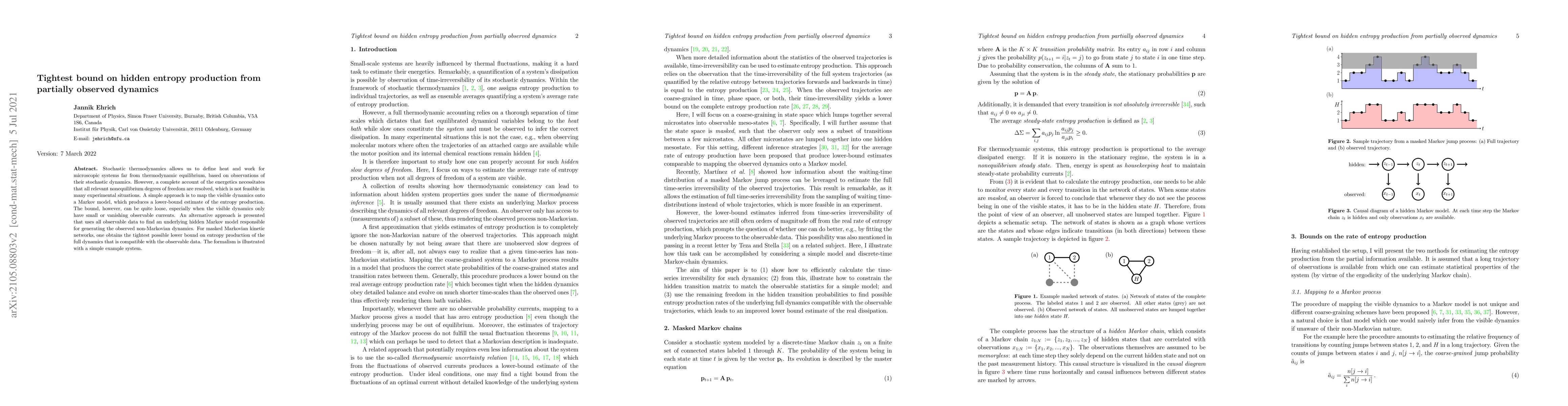 Stochastic thermodynamics allows us to define heat and work for microscopic systems far from thermodynamic equilibrium, based on observations of their stochastic dynamics. However, a complete account of the energetics necessitates that all relevant nonequilibrium degrees of freedom are resolved, which is not feasible in many experimental situations. A simple approach is to map the visible dynamics onto a Markov model, which produces a lower-bound estimate of the entropy production. The bound, however, can be quite loose, especially when the visible dynamics only have small or vanishing observable currents. An alternative approach is presented that uses all observable data to find an underlying hidden Markov model responsible for generating the observed non-Markovian dynamics. For masked Markovian kinetic networks, one obtains the tightest possible lower bound on entropy production of the full dynamics that is compatible with the observable data. The formalism is illustrated with a simple example system.
