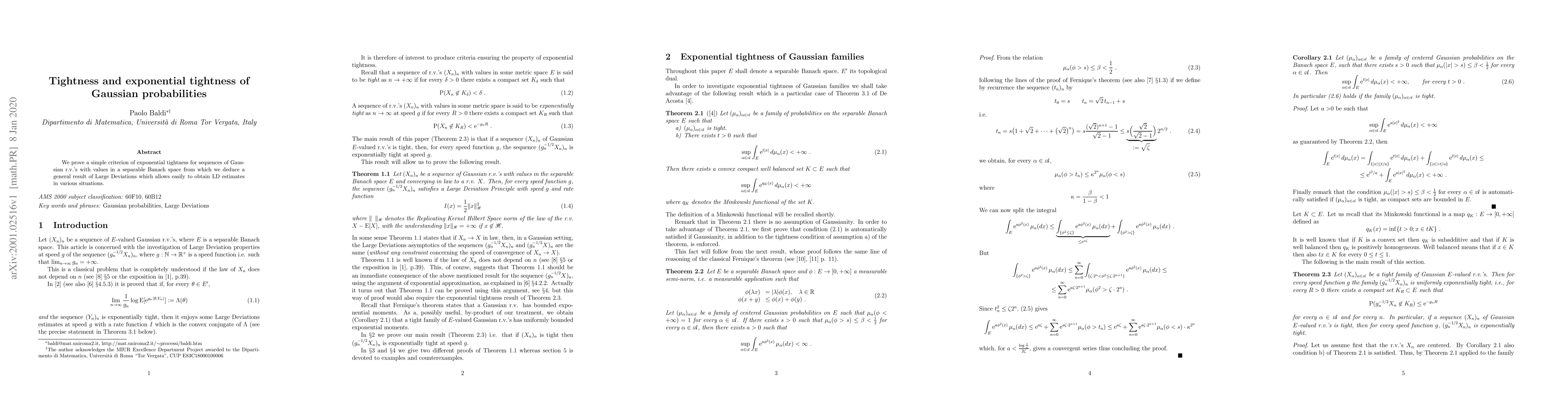 This paper proves a criterion for exponential tightness of Gaussian probabilities, enabling the derivation of Large Deviations estimates in various situations.